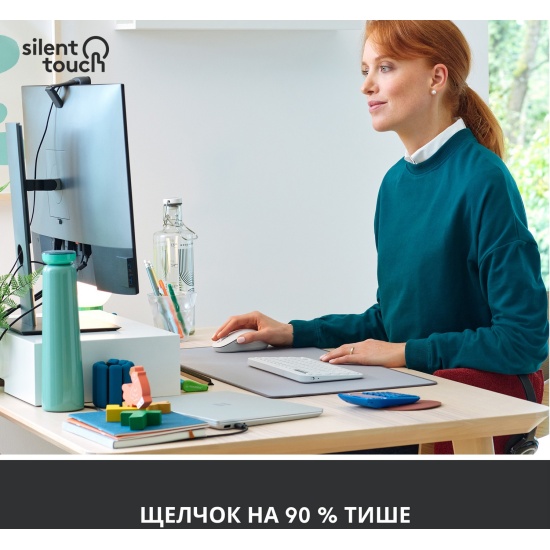 Больше никаких раздражающих щелчков. Уникальная технология Logitech SilentTouch на 90 % снижает громкость щелчка кнопок мыши снижена более чем на 90 % по сравнению с моделью Logitech M170.