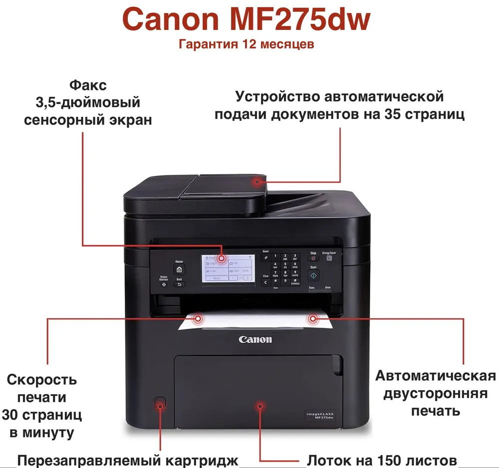 Принтер обеспечивает высокую скорость печати до 30 страниц в минуту. Время прогрева После включения 9,0 секунд или менее (до готовности копии). После выхода из спящего режима не более 3,2 секунд. Отличное качество текста. Качество текста считается отличным, даже при стандартной скорости печати.