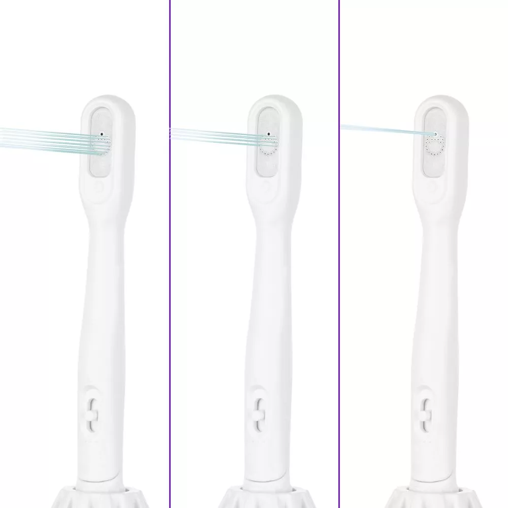 Начинать стоит с самого слабого режима «Мягко» и постепенно переходить на более сильные режимы по мере привыкания дёсен. При работе на корпусе светится индикатор выбранного режима. Ирригатор имеет автоматическое отключение после 2 мин непрерывной работы. Регулируете количество струй, захватывая бóльшую площадь полости рта, чем струйной насадкой. На 1м режиме задействуется max количество струй, на 2м работает меньше отверстий, от чего давление струй выше. На 3м режиме насадка выдаёт 1 мощную струю воды.