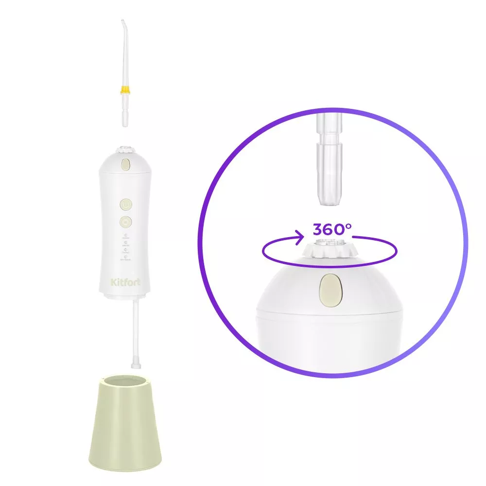 Резервуар для воды ёмкостью 200 мл съёмный. Его удобно наполнять водой и мыть после использования. На держателе насадки есть поворотный механизм, с помощью которого насадка крутится на 360°.