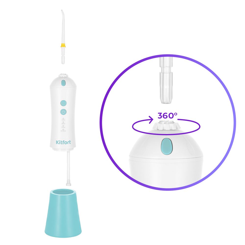 Резервуар для воды ёмкостью 200 мл съёмный. Его удобно наполнять водой и мыть после использования. На держателе насадки есть поворотный механизм, с помощью которого насадка крутится на 360°.