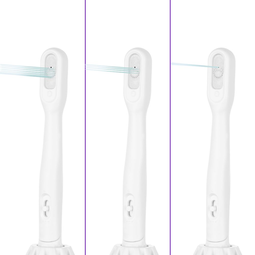 Регулируете количество струй, захватывая бóльшую площадь полости рта, чем струйной насадкой. На 1-м режиме задействуется максимальное количество струй, на 2-м работает меньше отверстий, от чего давление струй выше. На 3-м режиме насадка выдаёт 1 мощную струю воды.