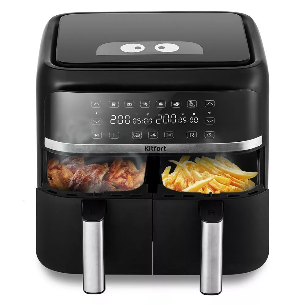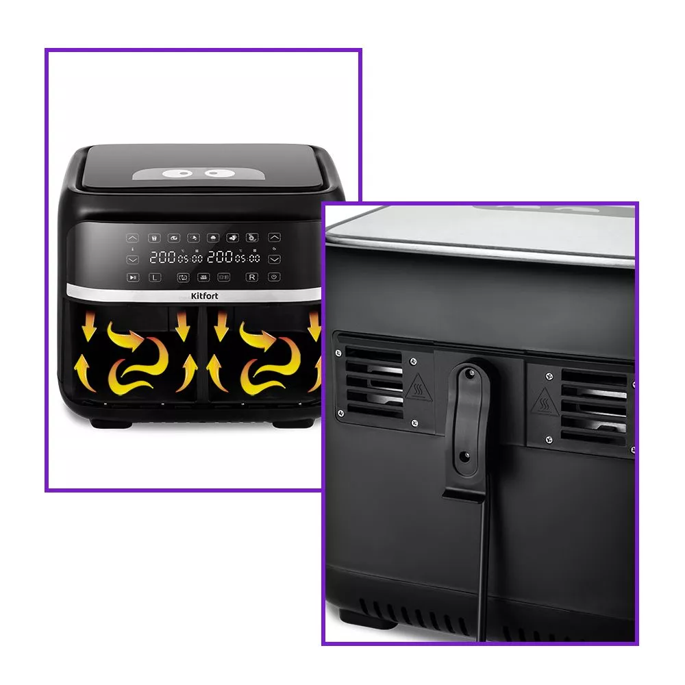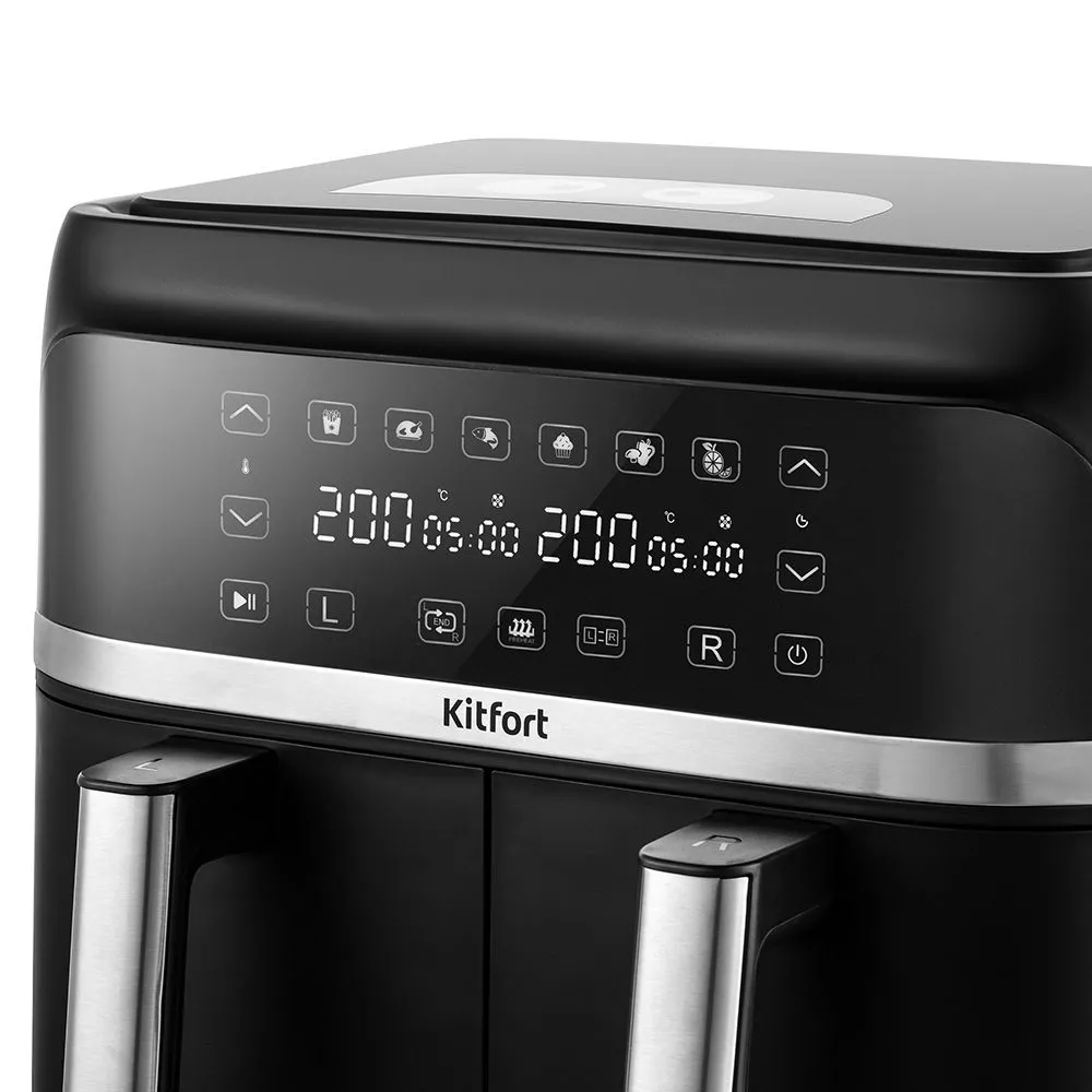 Аэрогриль оснащён сенсорным управлением, имеет 6 программ, синхронизацию приготовления и подогрев. Можно установить таймер до 60 мин и t° до 200°C для каждого нагревателя. На дисплее отображаются заданные параметры и какие нагреватели работают.