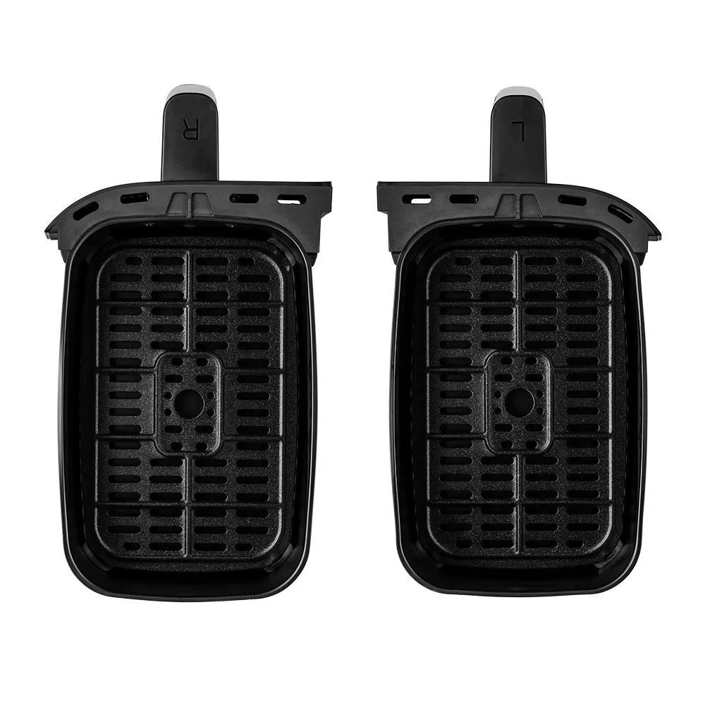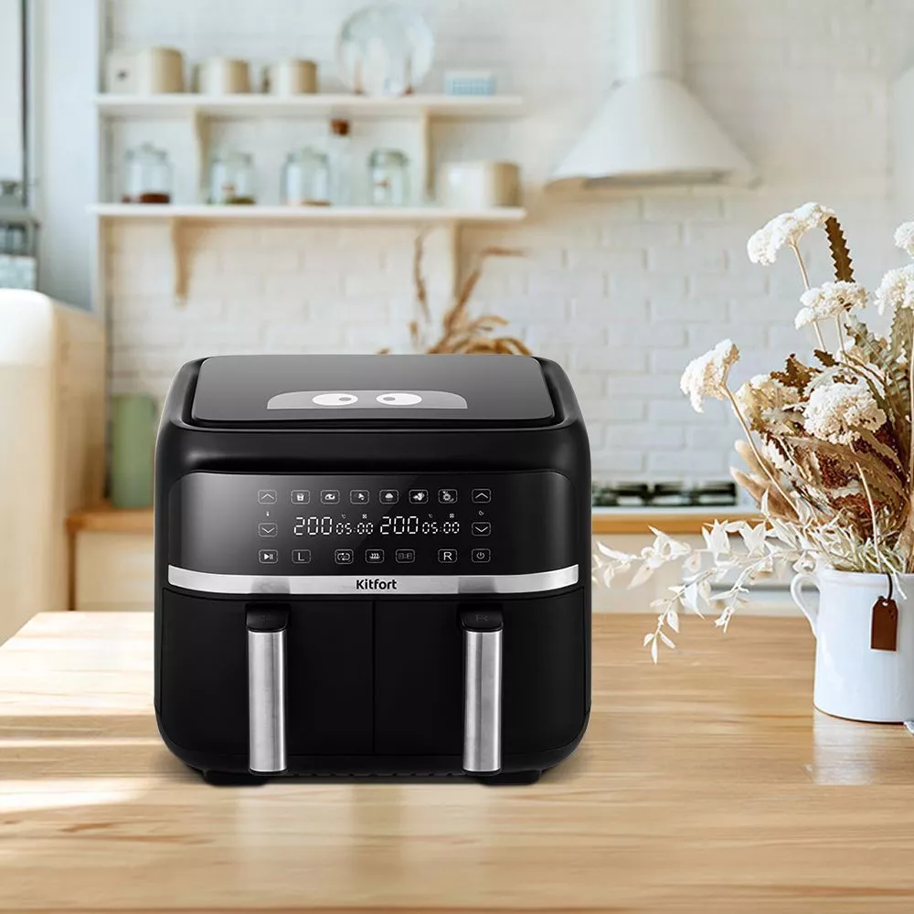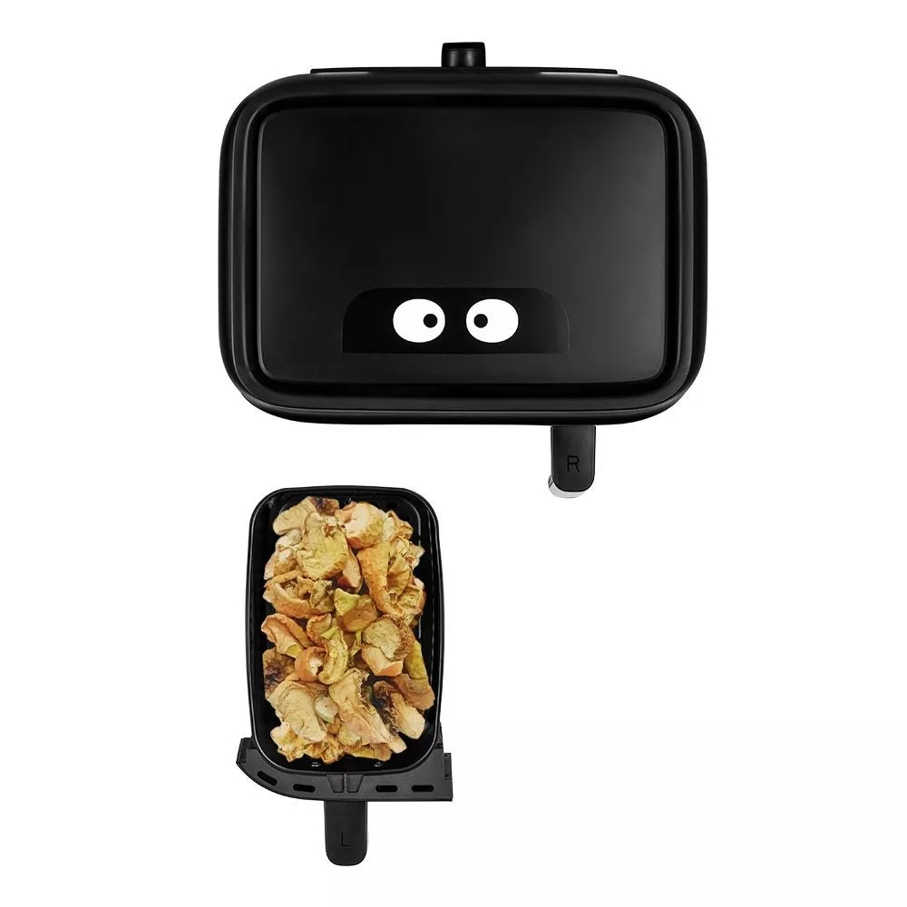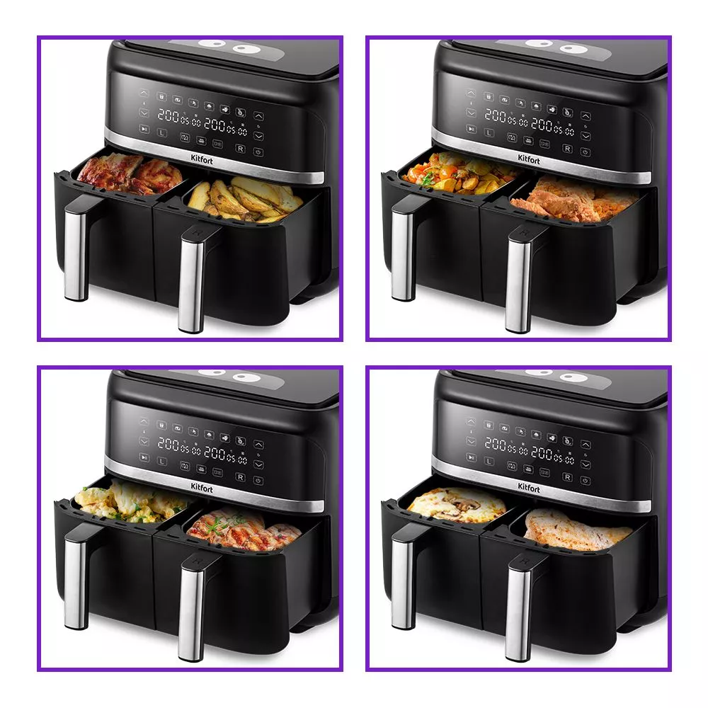 Аэрогриль оснащён сенсорным управлением, имеет 6 программ, синхронизацию приготовления и подогрев. Можно установить таймер до 60 мин и t° до 200°C для каждого нагревателя. На дисплее отображаются заданные параметры и какие нагреватели работают.