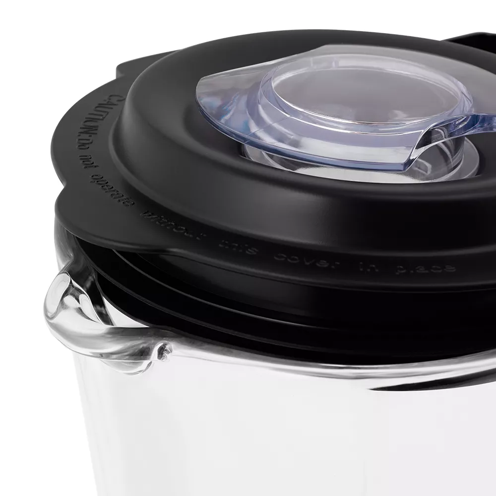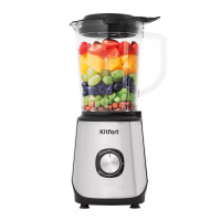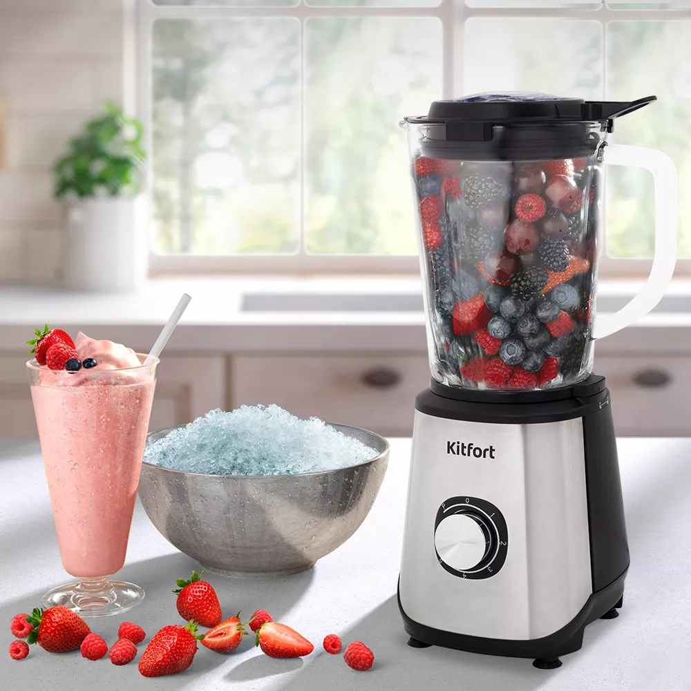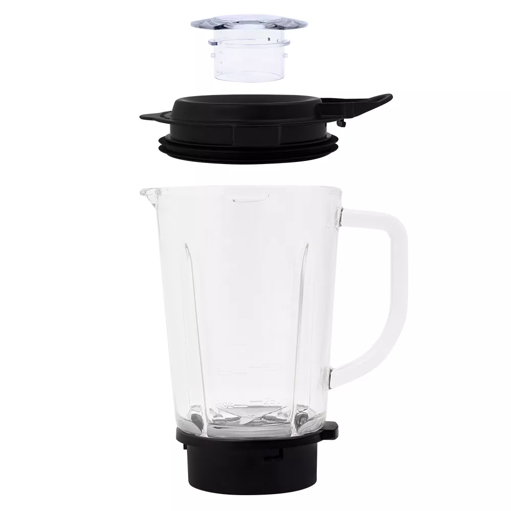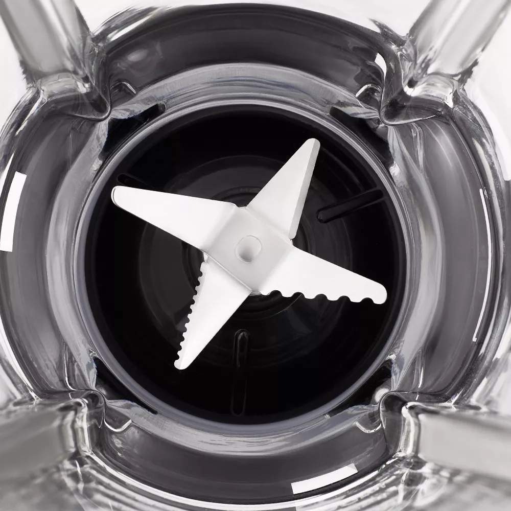Блендер оснащён прочным 4-лезвийным ножом из нержавеющей стали с оптимальной формой лезвий и заточки для эффективного измельчения продуктов. Чаша блендера ёмкостью 1,7 л выполнена из прочного стекла. В крышке блендера есть отверстие для добавления ингредиентов во время работы. Устройство легко разбирается и позволяет тщательно промывать его детали.
