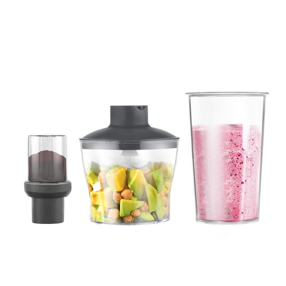 В комплект также входят насадки для взбивания и замешивания теста, чоппер для шинковки и измельчения объемом 650 мл, насадка для приготовления пюре, капучинатор для взбивания молока, кофемолка и мерный стакан объемом 800 мл.