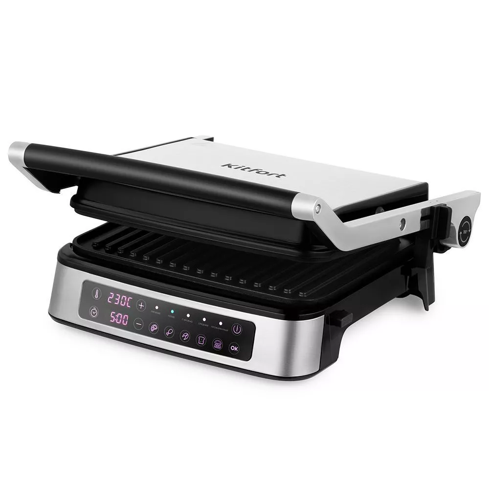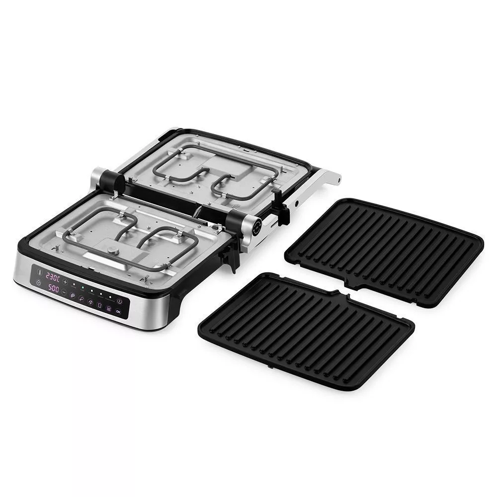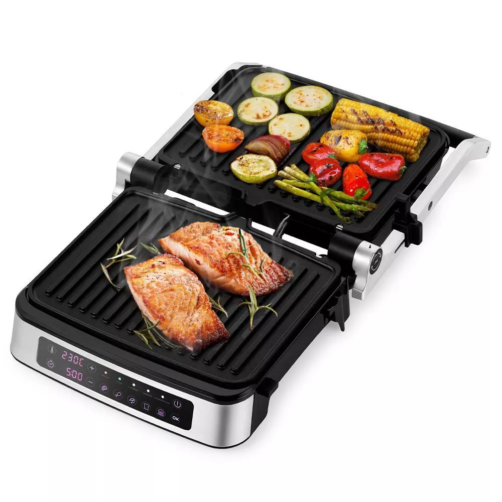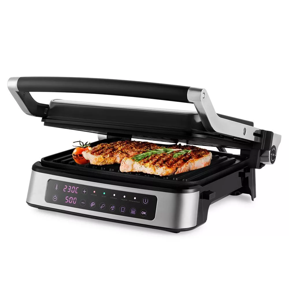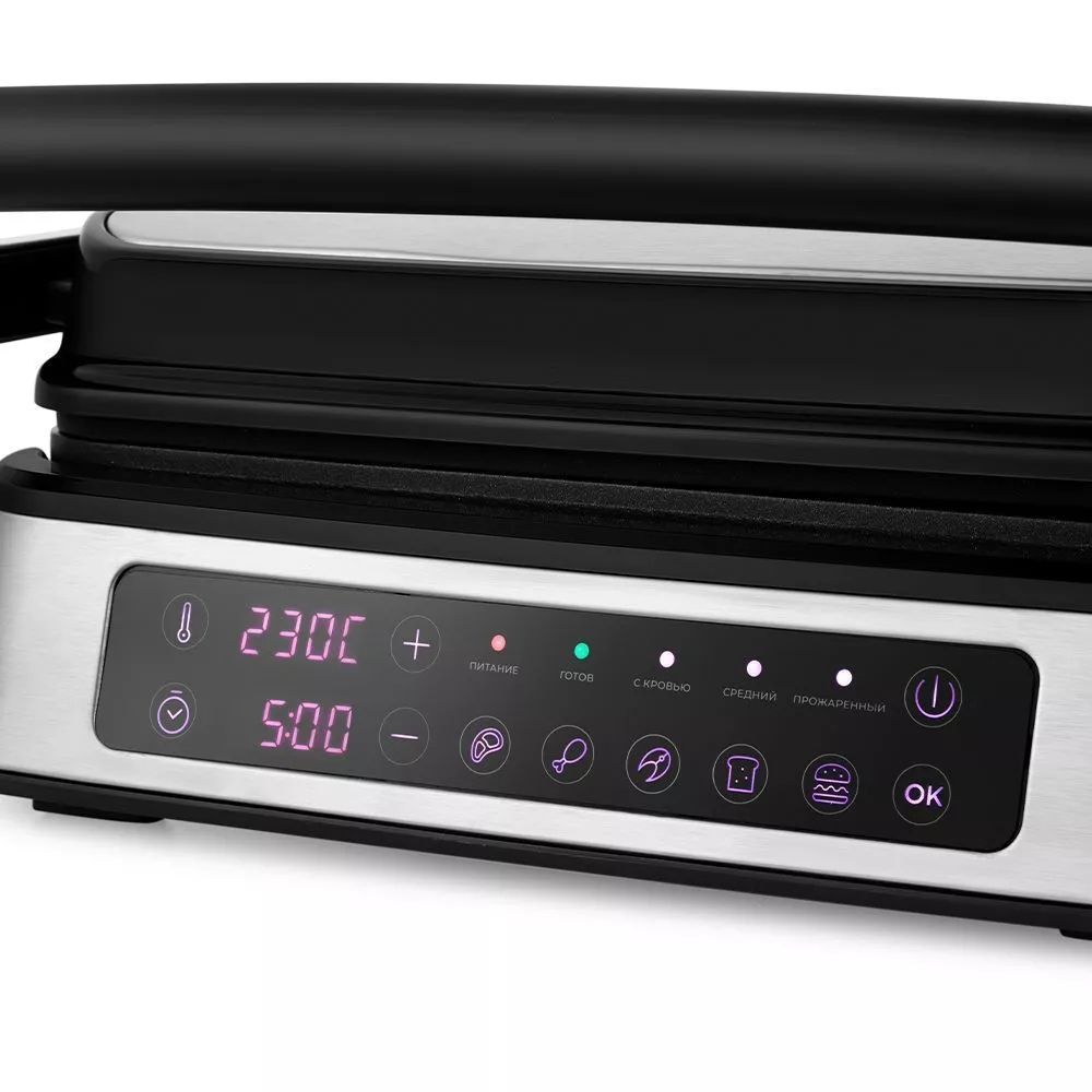 С помощью панели управления вы можете выбрать автоматический режим работы: мясо, рыба, курица, сосиски, гамбургер и бекон. Вы также можете вручную установить температуру нагрева до 230°C. Кроме того, прибор обладает настройкой степени прожарки.