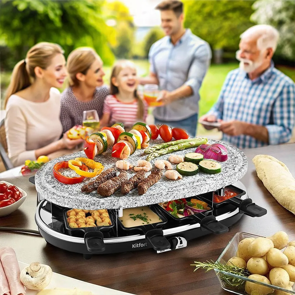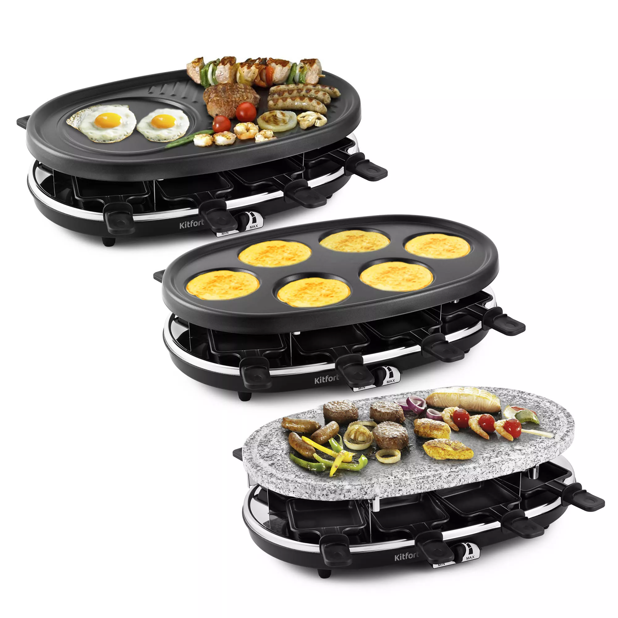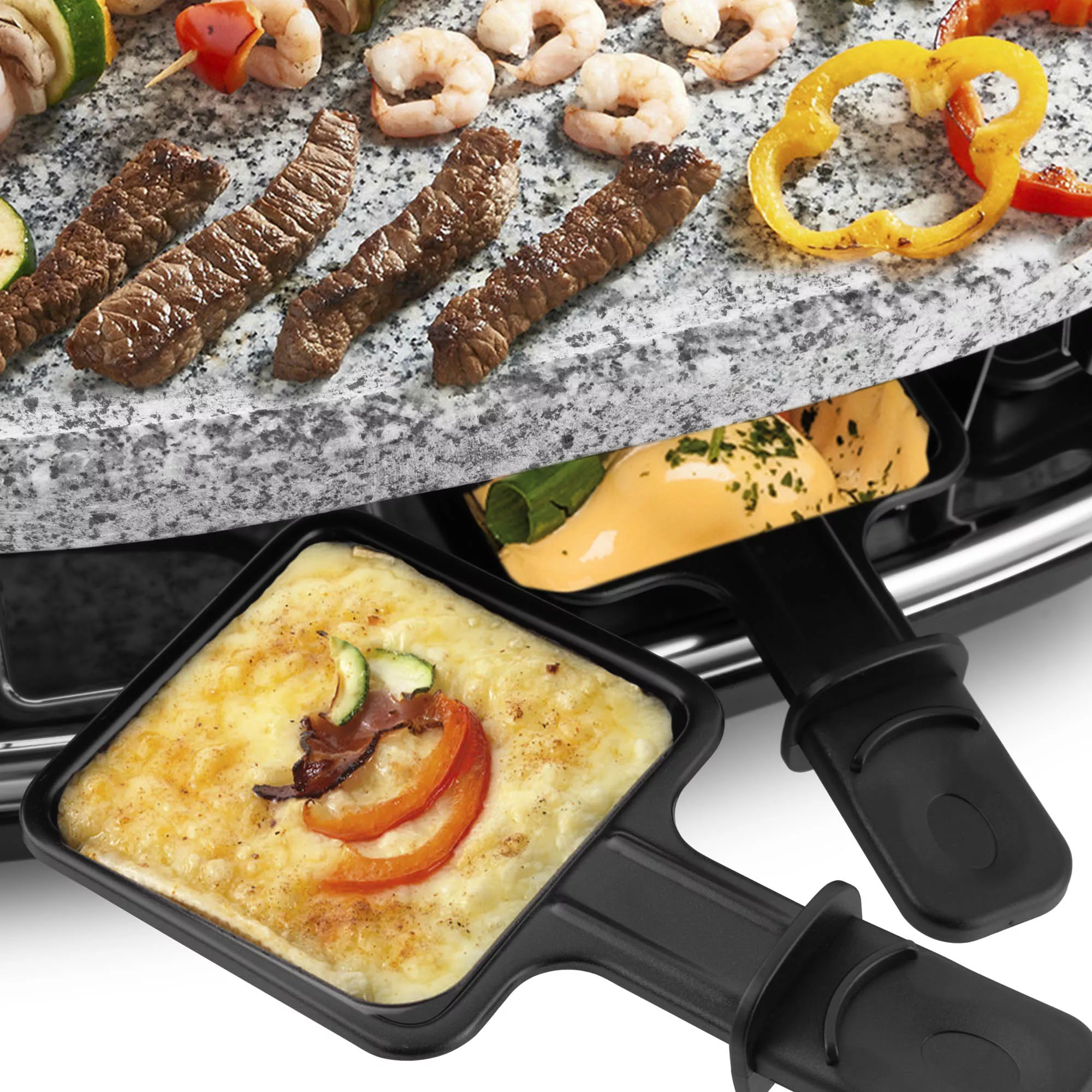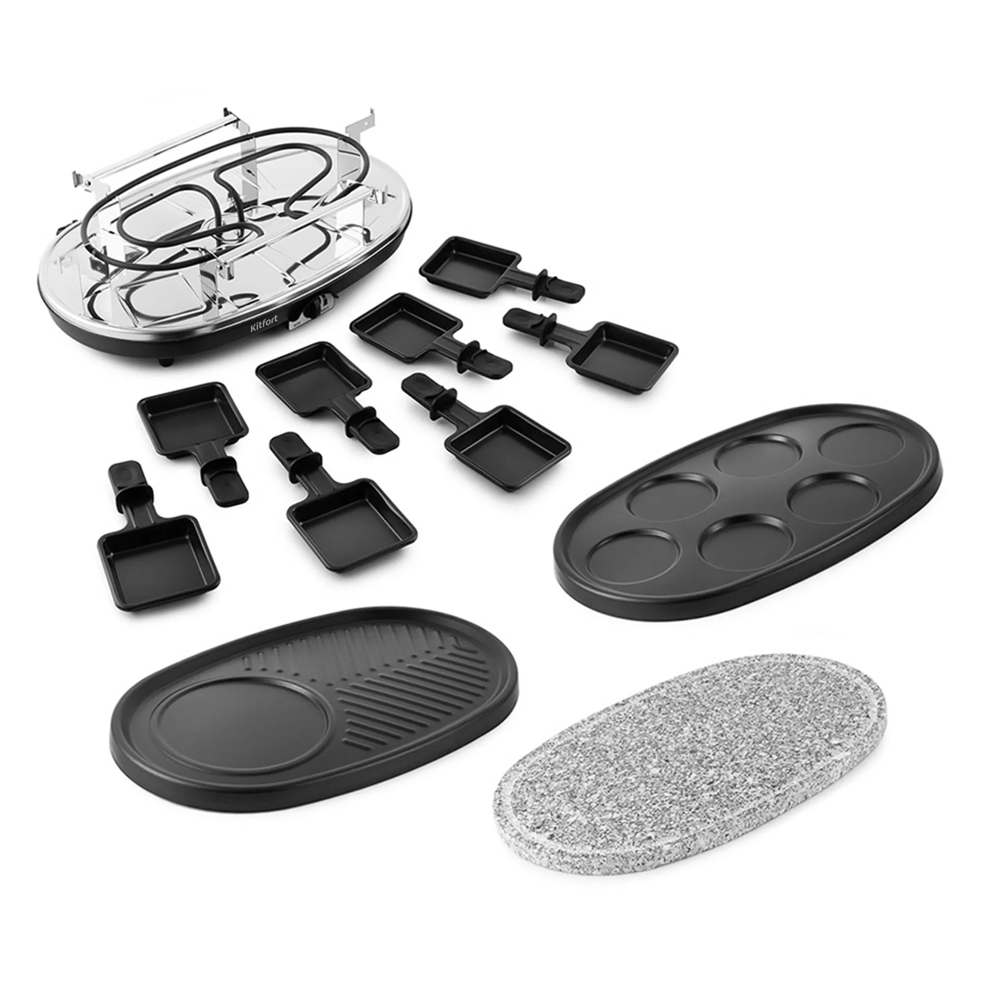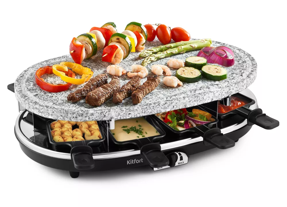Устройство оснащено ТЭНом, под которым имеются специальные углубления для порционных сковородок для сыра. Сверху ТЭН закрывает панель, на которой можно обжаривать продукты. ТЭН раклетницы нагревает панель для гриля и расплавляет сыр в сковородках. На верхний ярус устанавливается одна из панелей по вашему желанию: каменная плита, гриль + блинница, панель для блинчиков. Готовьте самые разнообразные блюда на свой вкус!