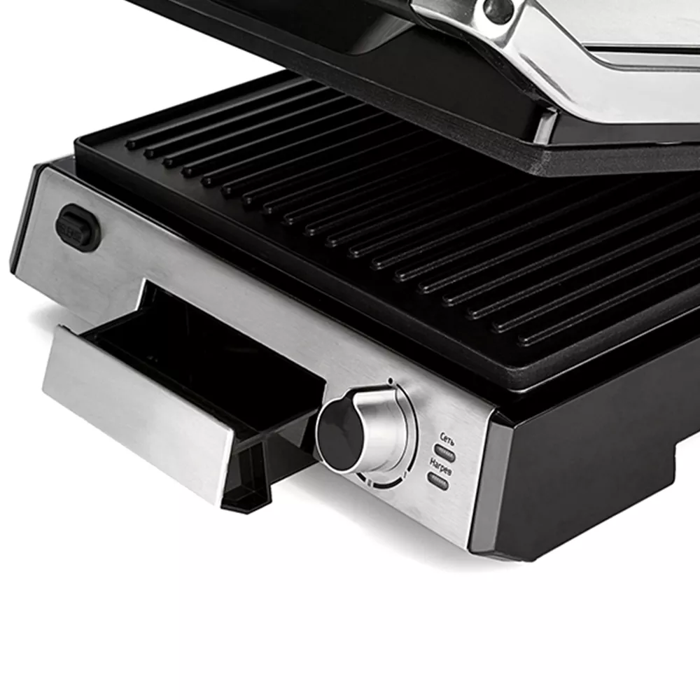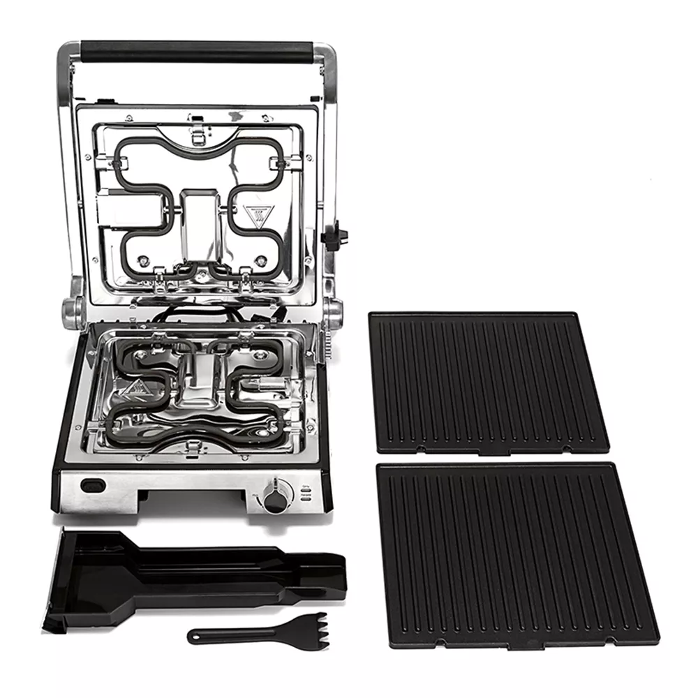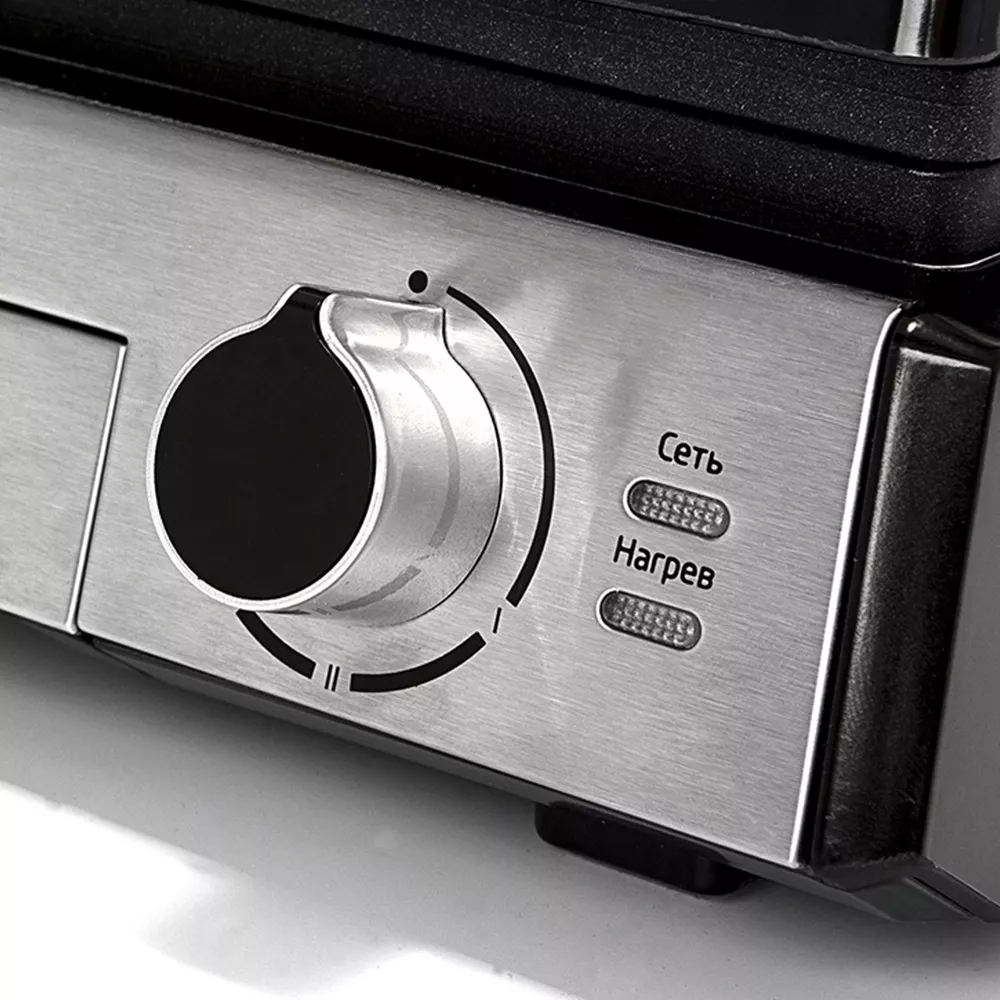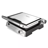 В одностороннем режиме крышка гриля откидывается на 180 °, и гриль превращается в большую жаровню. Для приготовления можно использовать обе поверхности. Гриль оснащен термостатом с плавной регулировкой, позволяющим выставить температуру вплоть до 230 °С
