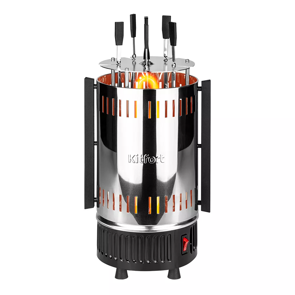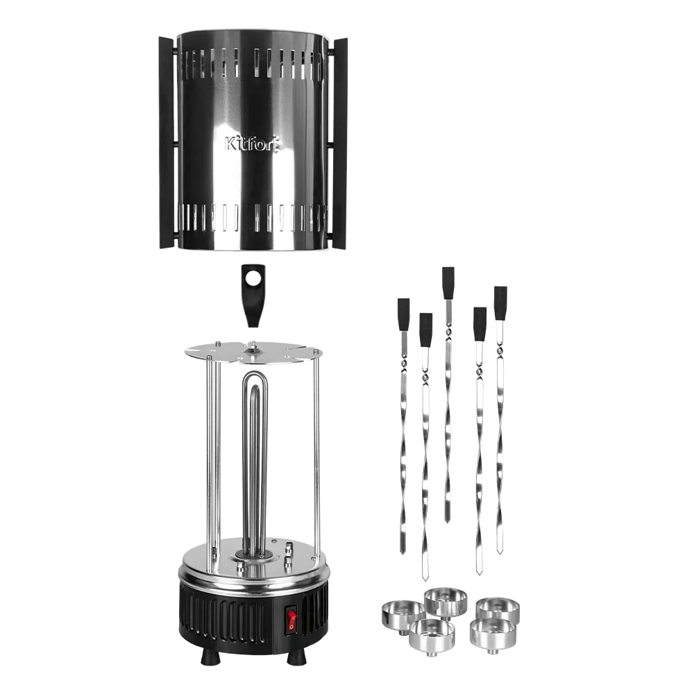 В комплекте с электрошашлычницей КТ-1405 идут 5 шампуров. Помимо шашлыка из мяса, рыбы или овощей, приготовьте также шаверму, сардельки, картошку, гренки или даже курицу гриль. За 1 раз вы можете приготовить до 1 кг шашлыка.