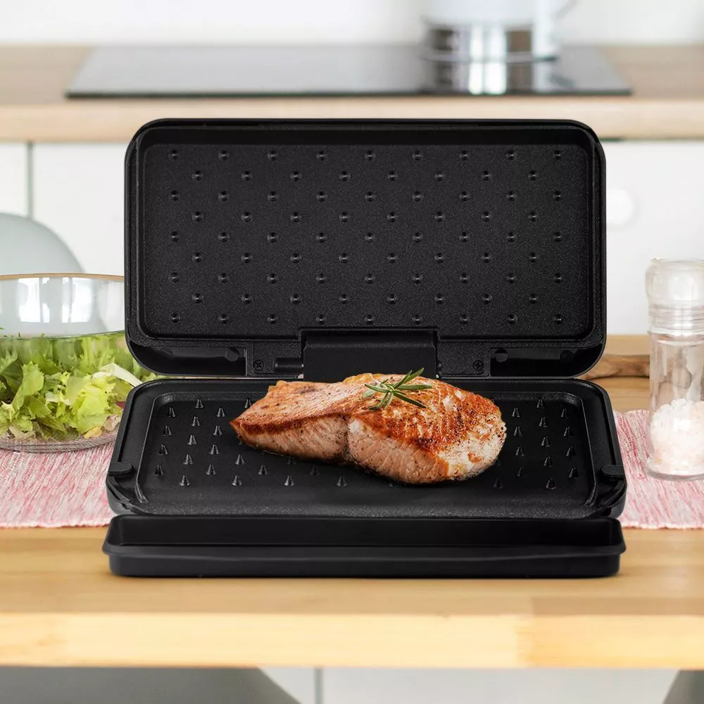 На панели нанесено антипригарное покрытие, что позволяет готовить с минимальным количеством масла или без него. Такие панели просто мыть. Весь лишний жир и сок из блюд попадёт в съёмный поддон.