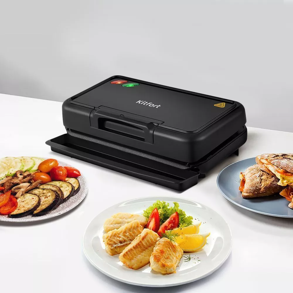 Конструкция электрогриля предусматривает приготовление продуктов с закрытой крышкой. Гриль КТ-3606 оснащён термостатом для поддержания температуры панелей. При таком приготовлении блюд продукты находятся между двух панелей и готовятся с 2х сторон.