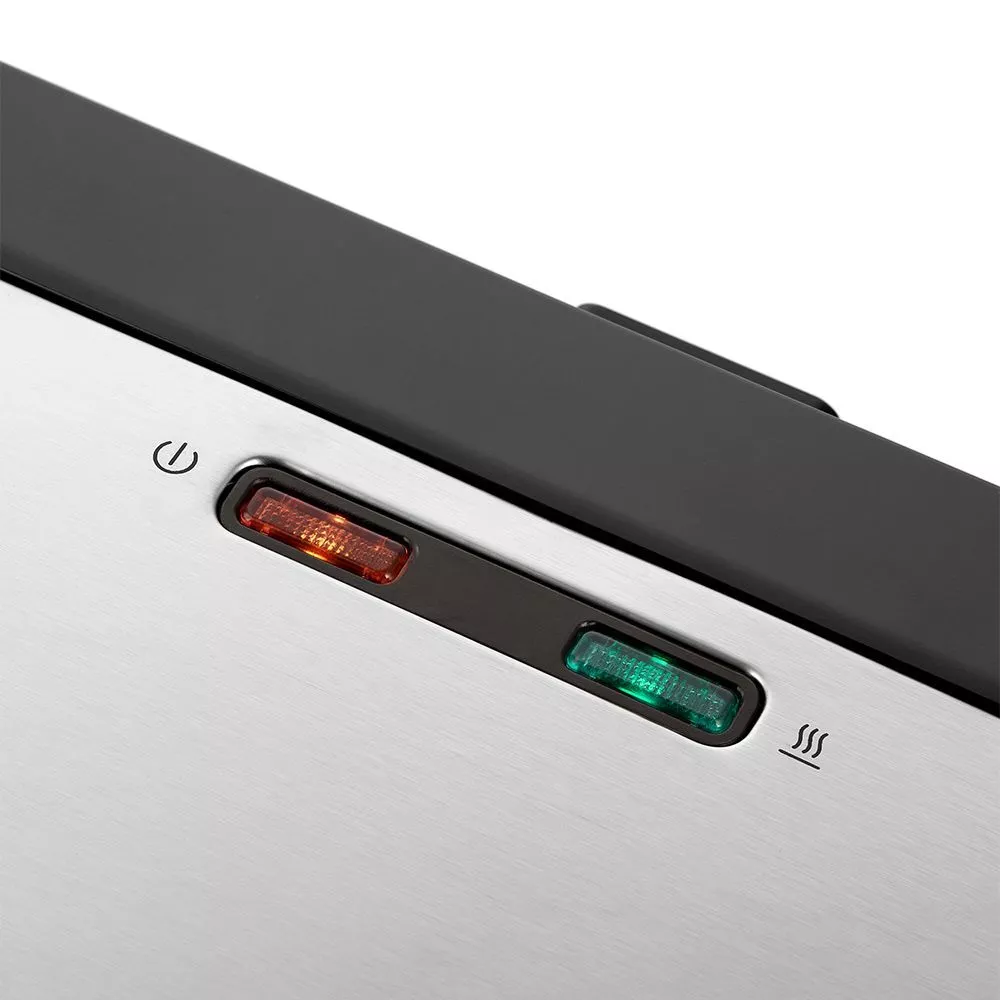 Индикатор работы горит, когда прибор включен в сеть. Индикатор нагрева загорается, когда панели достигают нужной температуры. Во время приготовления продуктов панели гриля остывают, поэтому нагрев будет периодически включаться для поддержания температуры.