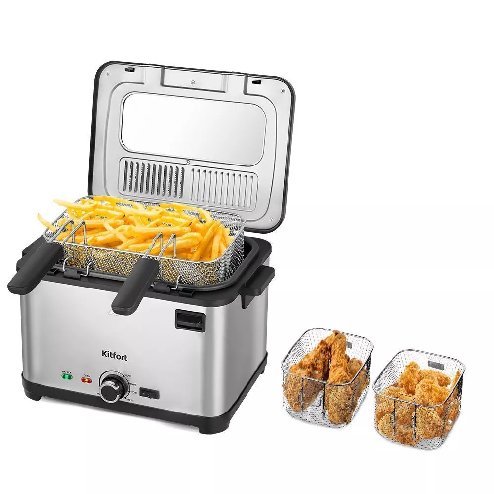В комплекте три корзины для жарки: одна большая и две малые. Для удобства хранения корзины для жарки имеют съёмные ручки. Две ручки по бокам прибора позволяют легко переносить фритюрницу.
