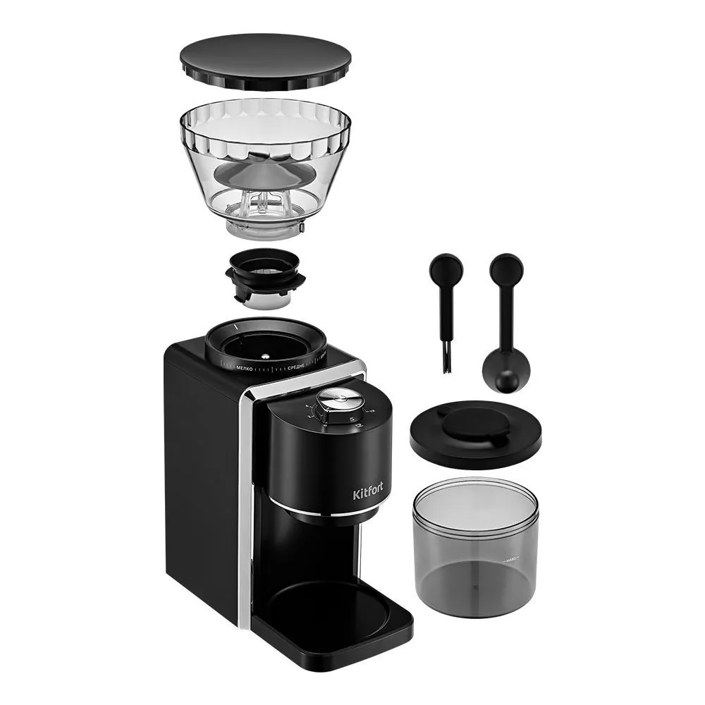 В контейнер для молотого кофе помещается около 130 г кофе. Он оснащён крышкой с заглушкой, поэтому может использоваться для хранения кофе. Контейнеры для молотого кофе и зёрен съёмные. Внешний жернов также съёмный - для удобства очистки. Под крышкой контейнера для зёрен можно закрепить щётку для очистки и мерную ложку, которые идут в комплекте.