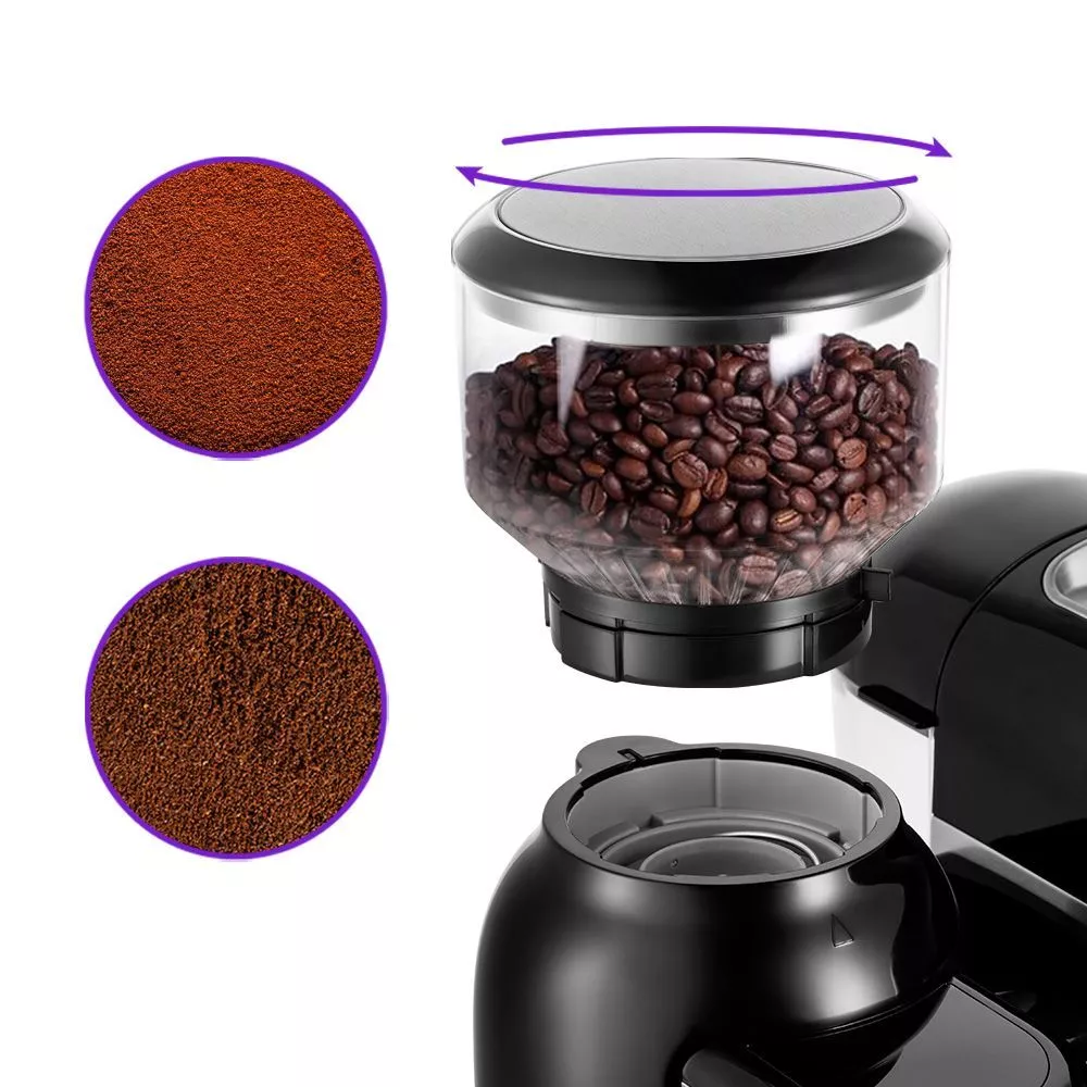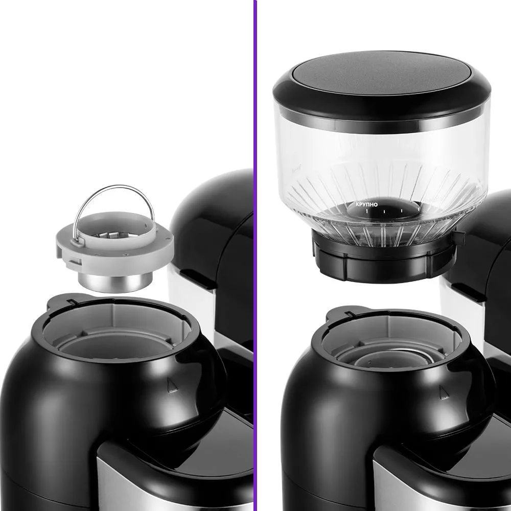 Встроенная кофемолка с коническими металлическими жерновами позволяет качественно измельчать кофейные зёрна непосредственно перед приготовлением кофе, что положительно отражается на вкусе готового напитка! Степень помола кофейных зерён настраивается поворотом резервуара для зёрен. Для более тонкого помола поворачивайте резервуар для кофейных зёрен справа налево, для более грубого помола - слева направо. Объём резервуара – 200 г., он легко снимается.