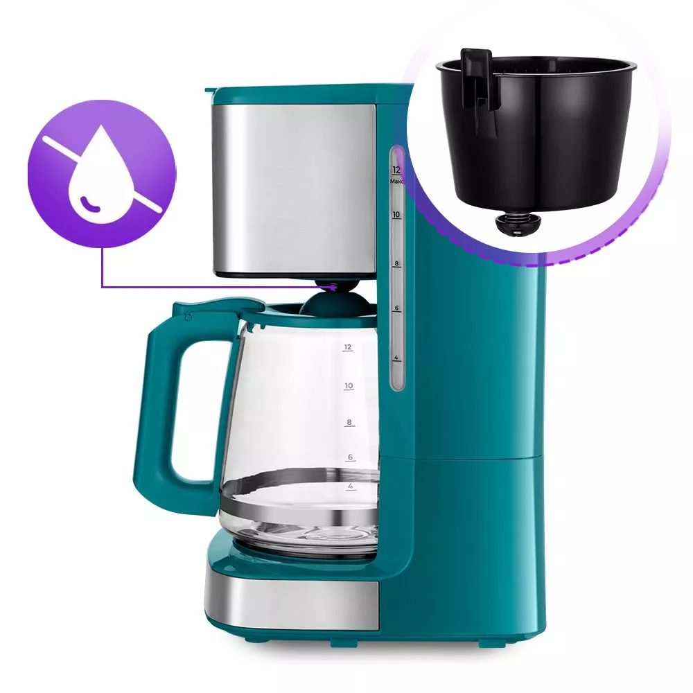 При приготовлении кофе вода нагревается, а затем подаётся в фильтр с молотым кофе. Многоразовым фильтром можно пользоваться неограниченное количество раз. Пройдя через фильтр, кофе попадает в кофейник. Воронка кофеварки оборудована противокапельной системой – затвором, приостанавливающим подачу кофе при вынимании кофейника из кофеварки. Вы можете налить кофе в чашку, не дожидаясь окончания приготовления.