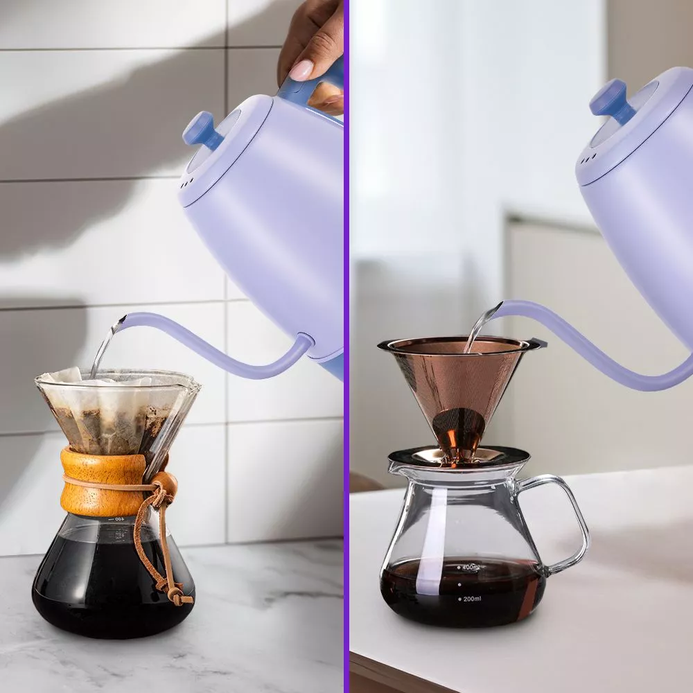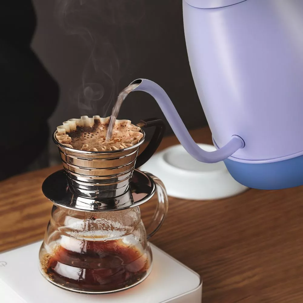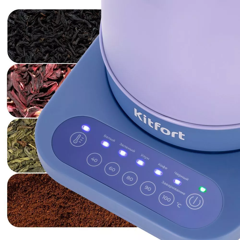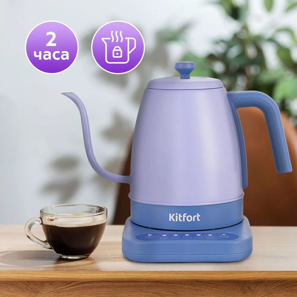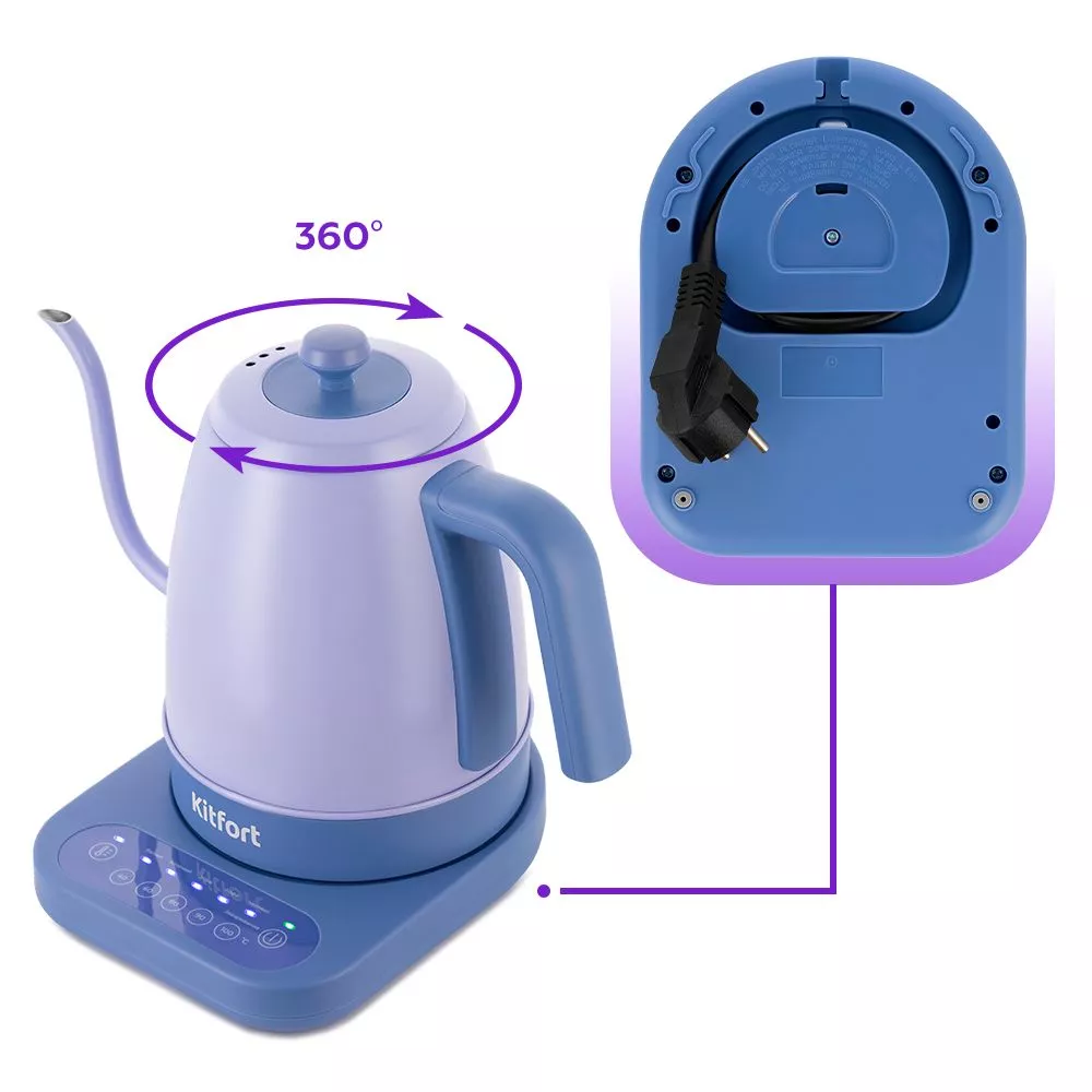 После нагрева или кипячения чайник может поддерживать температуру воды в течение 2 часов. Для включения этого режима достаточно нажать на соответствующую кнопку на панели управления. Всё это время будет гореть световой индикатор. Подставка с центральным контактом даёт возможность располагать на ней чайник в любом положении, обеспечивая вращение на 360°. Снизу имеется отсек для хранения шнура, в который можно смотать излишки, чтобы он не мешал на столе.