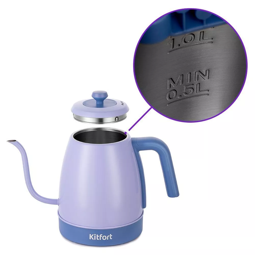 У чайника КТ-6613 ёмкостью 1 л полностью съёмная крышка, что облегчает процесс добавления воды и очистки. Мерная шкала размещена на внутренней части чайника. Ручка у прибора пластиковая. Она не нагревается и удобно лежит в руке.