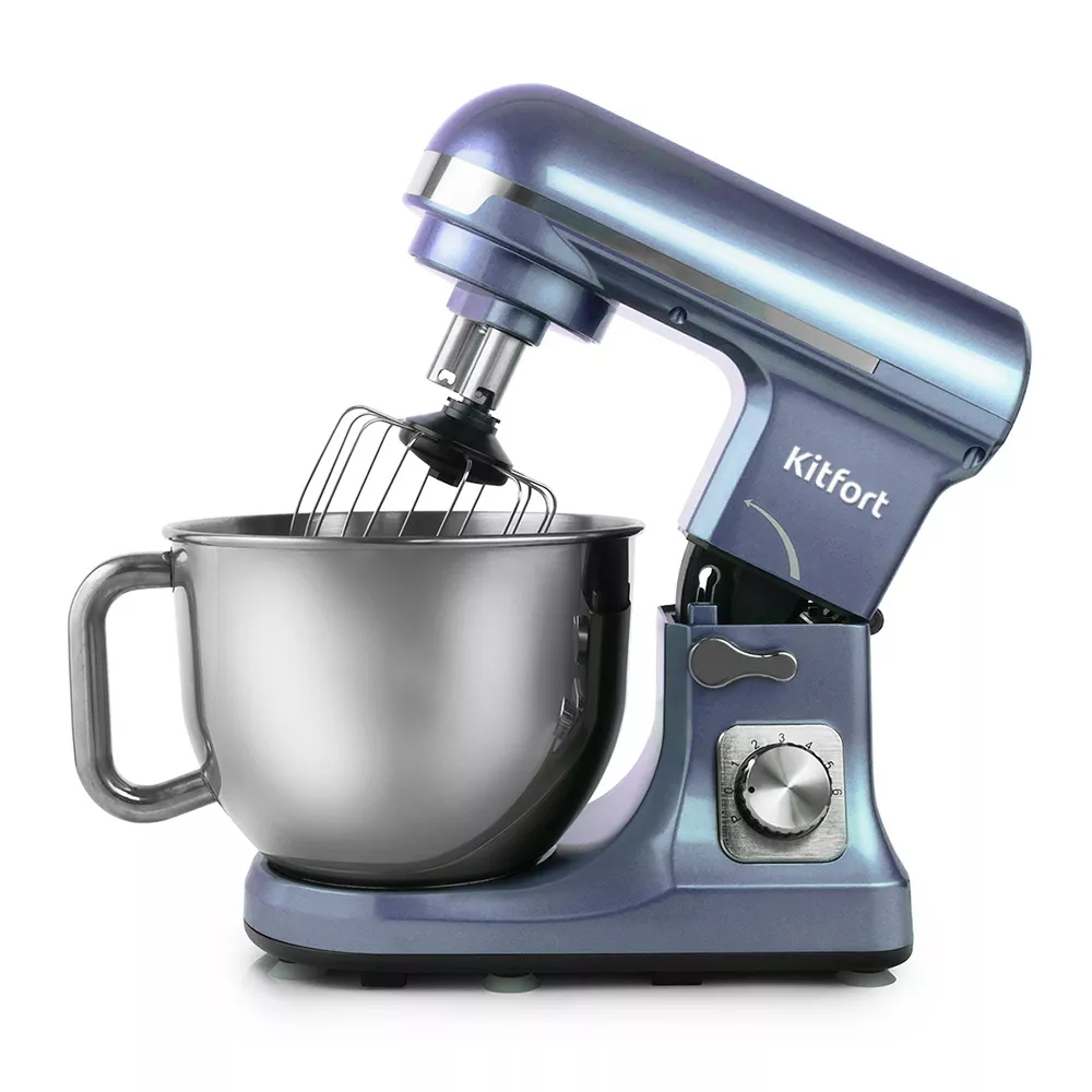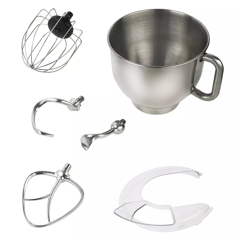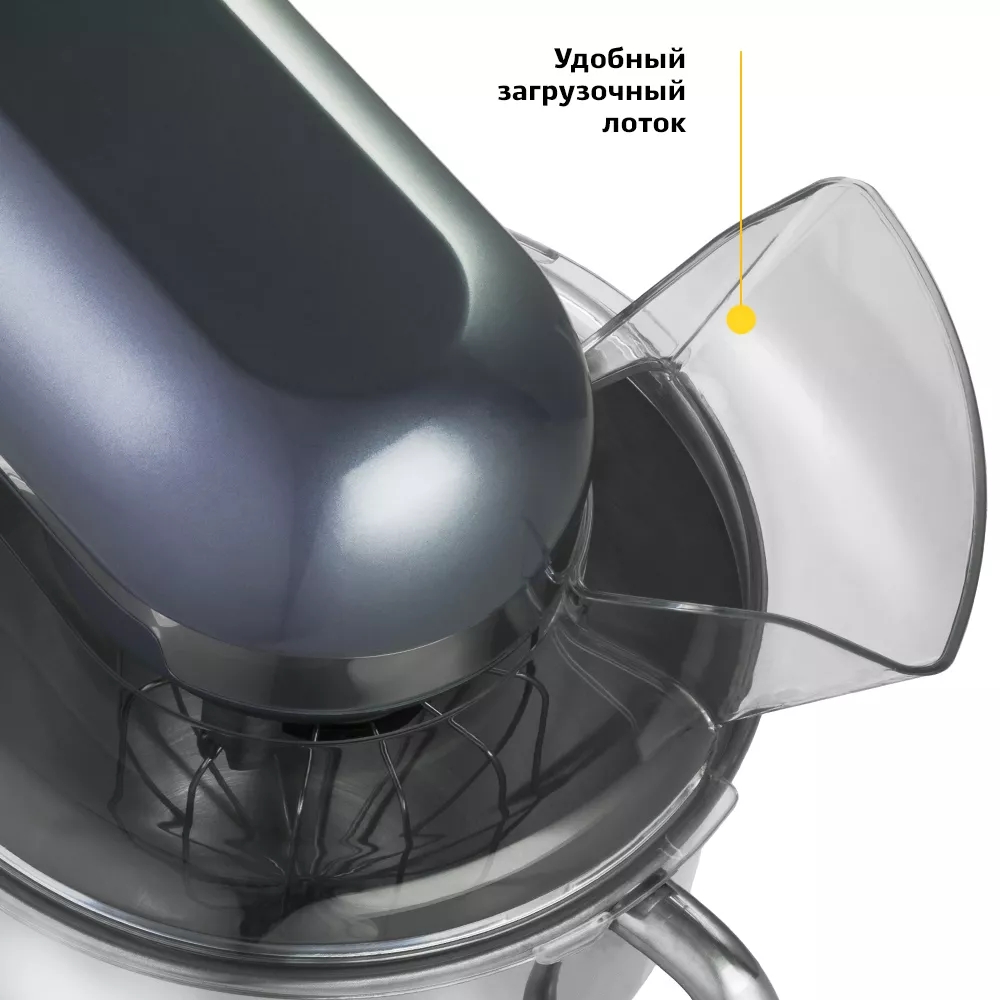 Миксер оснащён большой чашей объёмом 5 литров. А крышка чаши предотвращает разбрызгивание при замешивании и позволяет добавлять ингредиенты прямо во время работы.