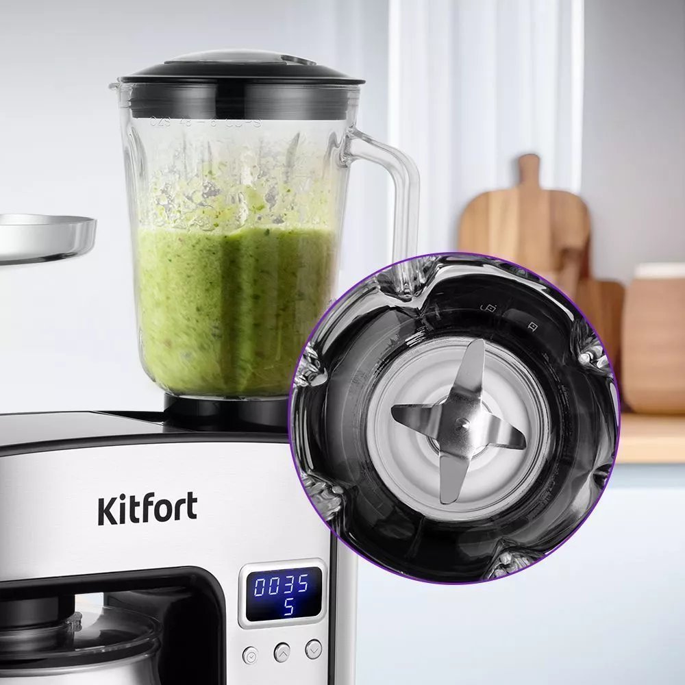 Блендер оснащён вместительной стеклянной чашей ёмкостью 1,5 л с мерной шкалой. В крышке чаши есть специальное отверстие, закрываемое мерным колпачком, для добавления ингредиентов непосредственно во время работы.