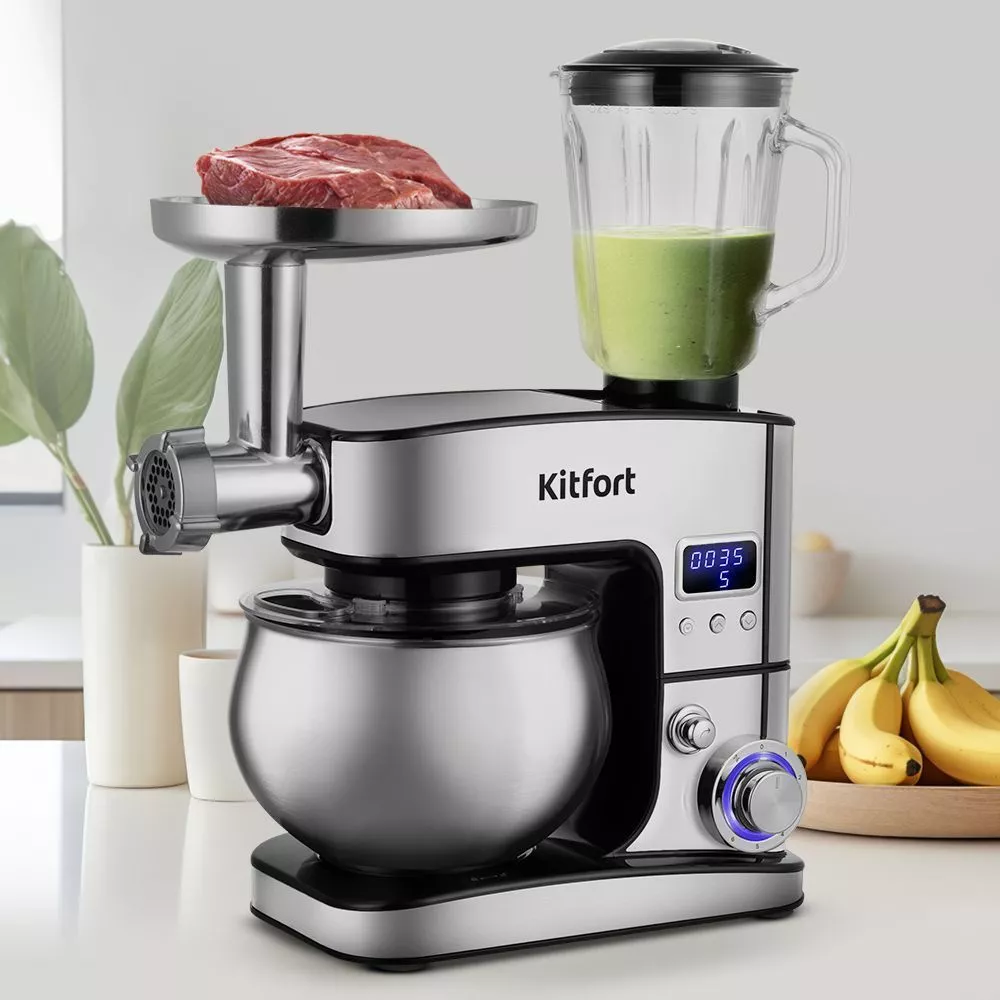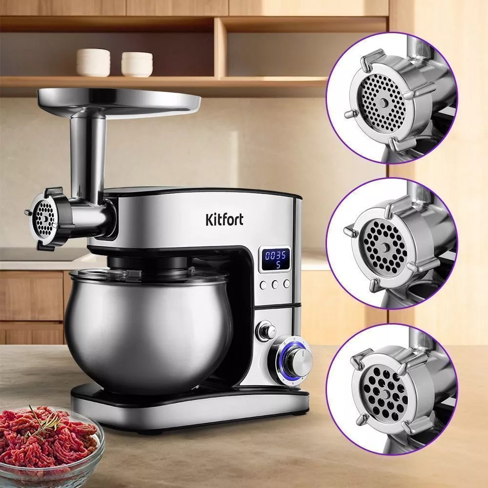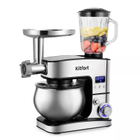 Прибор оснащён системой безопасности. Он автоматически выключится при откидывании моторного блока. В комплект входят мясорубка и блендер, что превращает эту модель в универсальную кухонную машину «3 в 1».