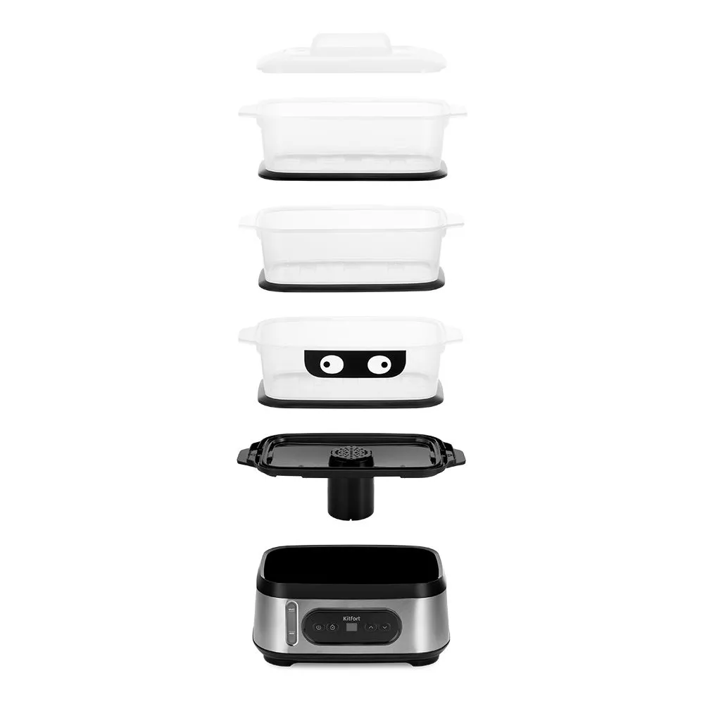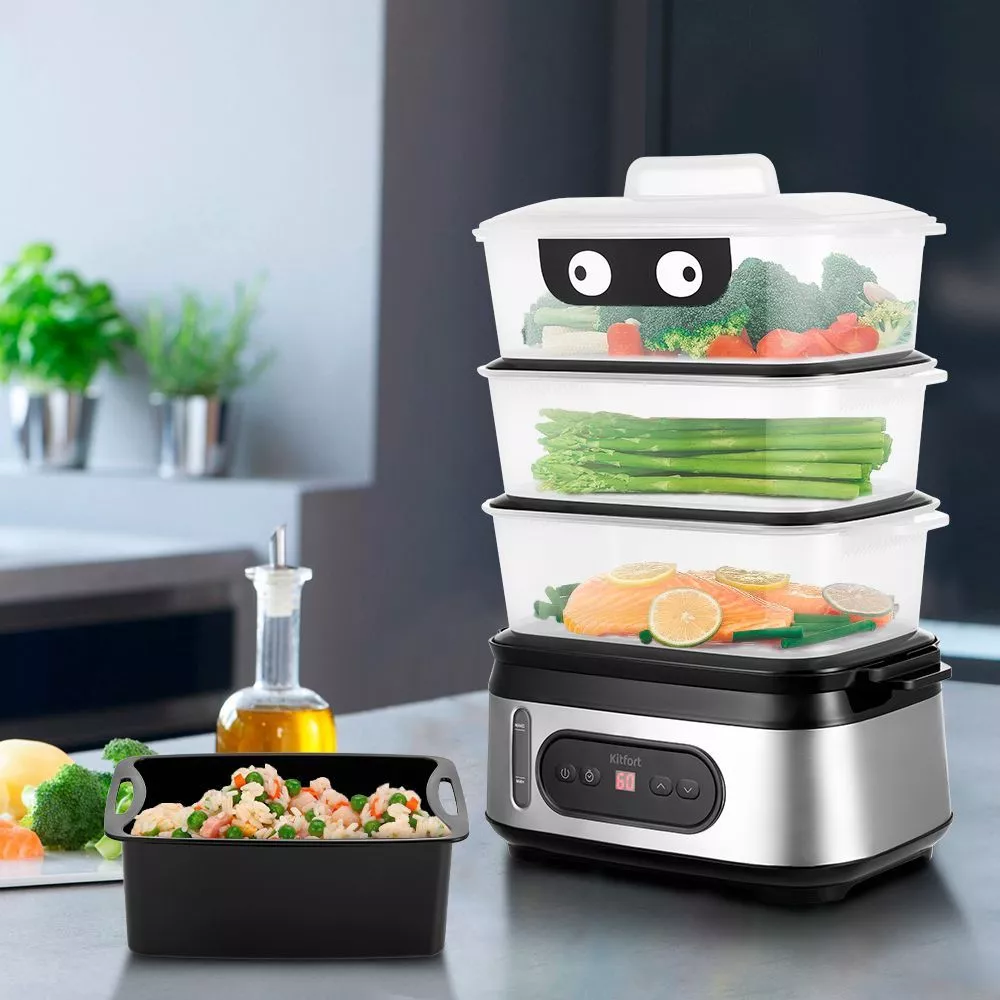 КТ-4082 оснащена тремя паровыми корзинами ёмкостью 3 литра, что позволит приготовить обед из нескольких блюд сразу на всю семью. В специальной чаше для риса вы сможете готовить каши, супы, пудинги и йогурты.