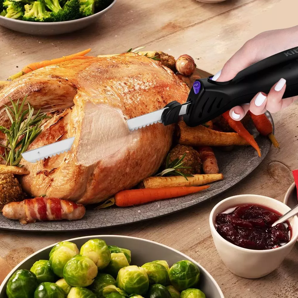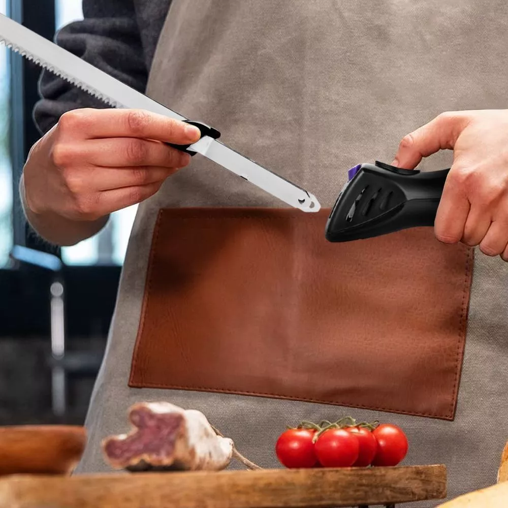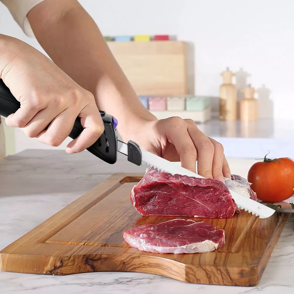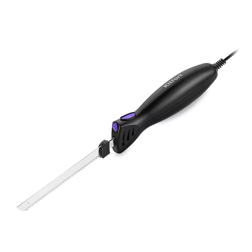 Электронож Kitfort KT-4071 отличается низким уровнем шума и вибраций <80 дБ. Прибор имеет всего 1 скорость движения ножей. Корпус электроножа выполнен из пластика, а его эргономичная ручка удобно лежит в руке.
