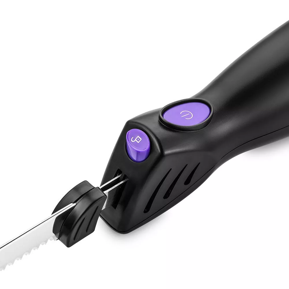Кнопка включения запускает движение ножей. Устройство работает, пока вы удерживаете кнопку. Также электронож КТ-4071 оснащён кнопкой снятия ножей для их лёгкого и безопасного извлечения из корпуса.