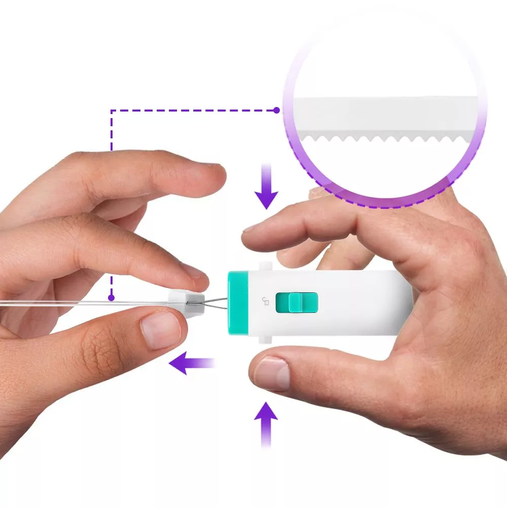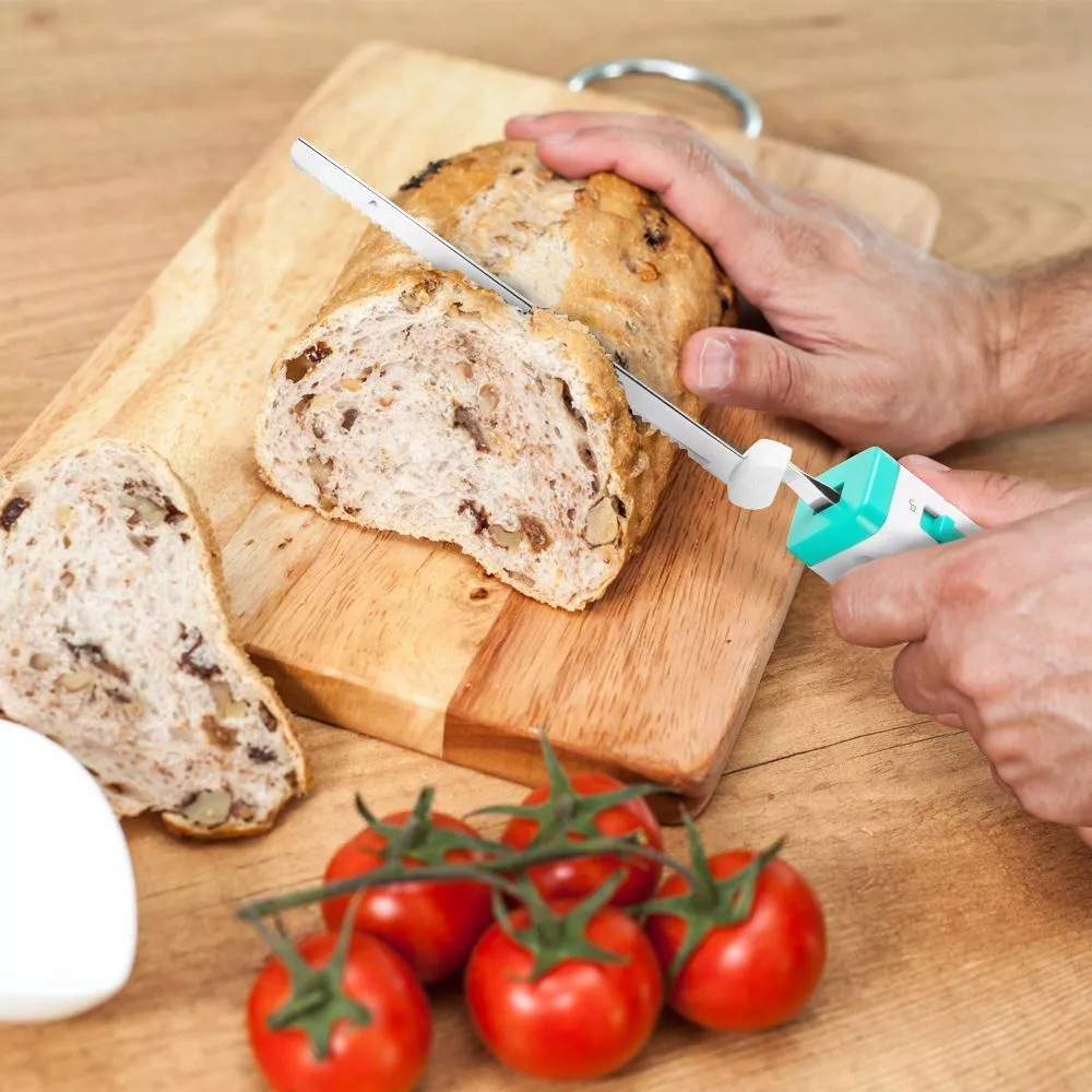 В данной модели предусмотрена кнопка - предохранитель. Для активации ножа необходимо сдвинуть переключатель в сторону, после чего можно будет нажать кнопку включения. Вы можете надеть на руку специальную петельку для удобства и безопасности.