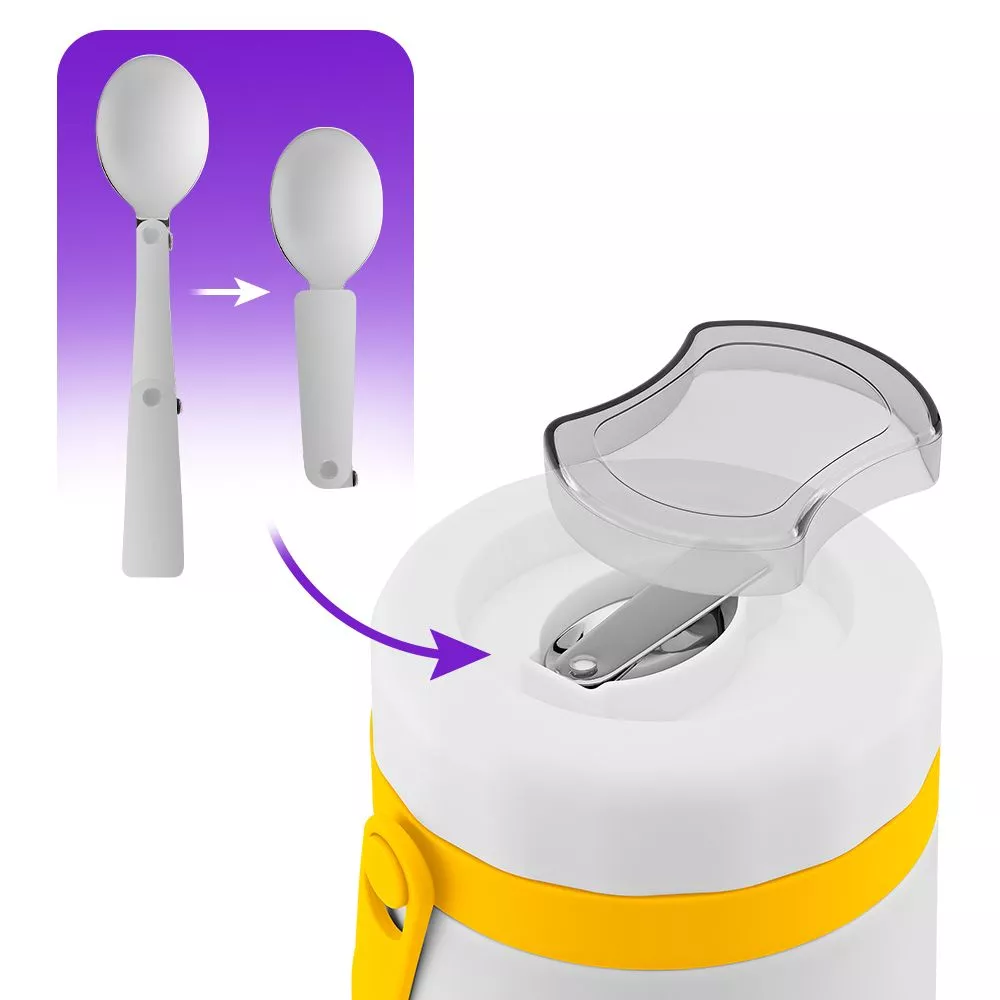 В комплекте предусмотрена ложка из нержавеющей стали. Ложка складная и легко помещается на крышке ланч-бокса. Ланч-бокс и контейнеры оснащены ручками для переноски. Ручки можно снять при необходимости.