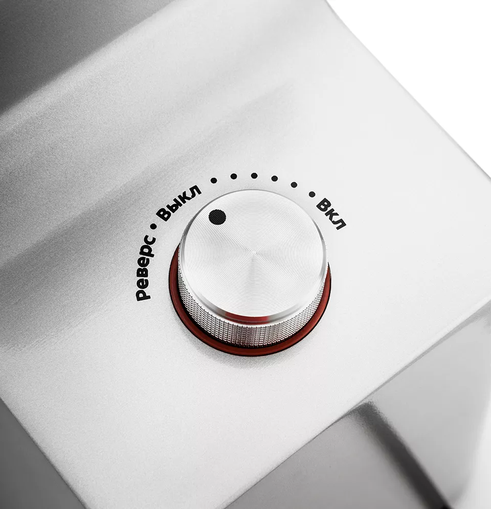 Прибор имеет одну скорость работы. Если вам необходимо удалить застрявшие в мясорубке куски мяса и жилы, не нужно разбирать мясорубку, достаточно лишь просто включить реверс.