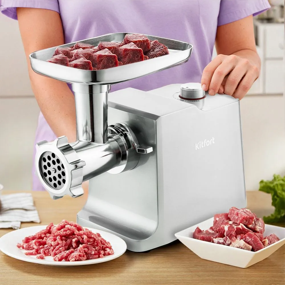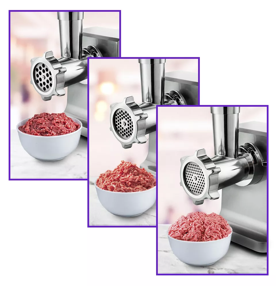 В комплект входят решётки для фарша различного диаметра, которые позволят сделать как котлеты и бифштексы, так и нежнейшие фрикадельки, например, для детского питания. Насадки для колбас и кеббе используются для приготовления колбасок.