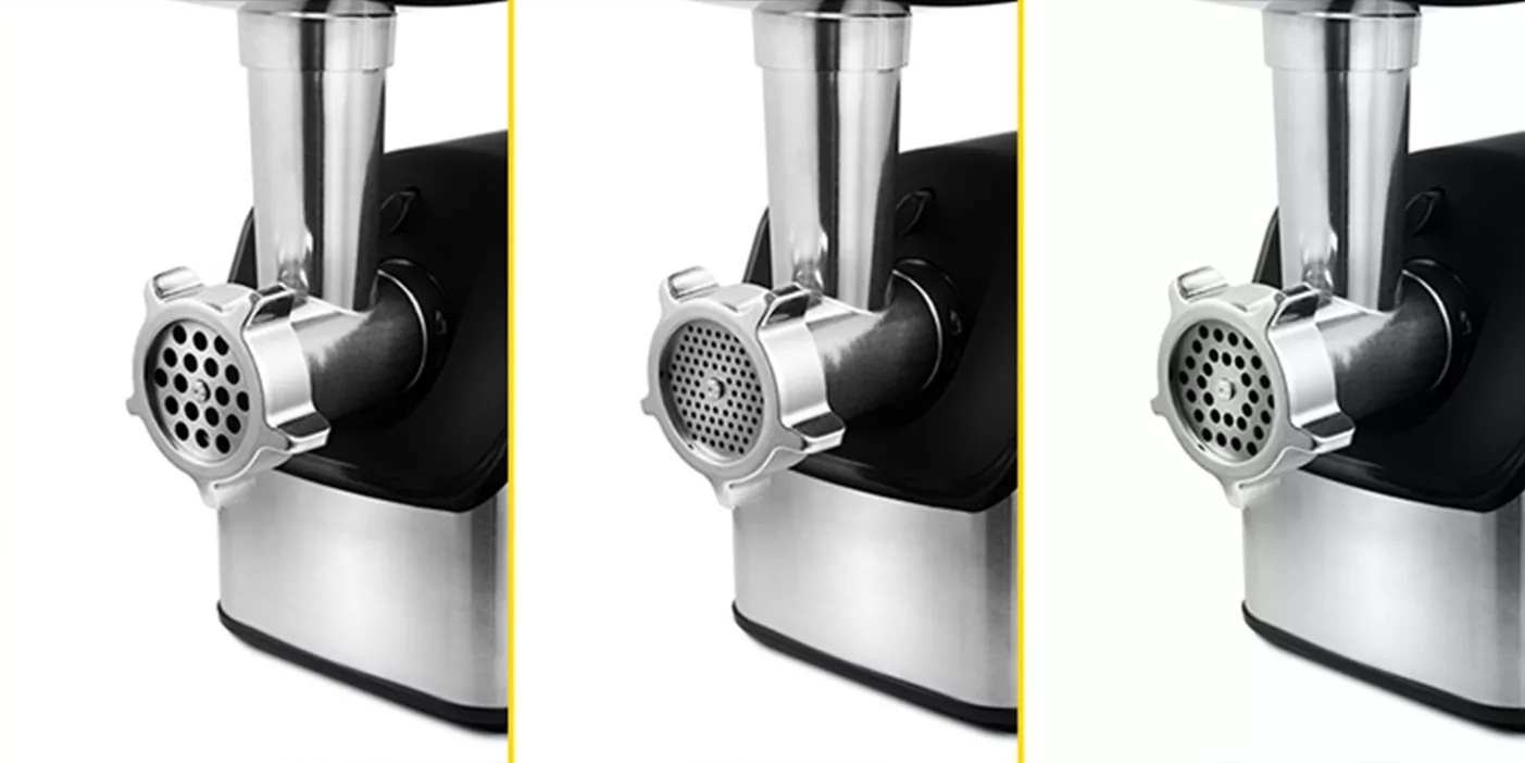 В комплект входят решётки для фарша разного диаметра 3, 5 и 7 мм, которые позволят сделать как котлеты и бифштексы, так и нежнейшие фрикадельки, например, для детского питания. Насадки для колбас и кеббе используются для приготовления колбасок.