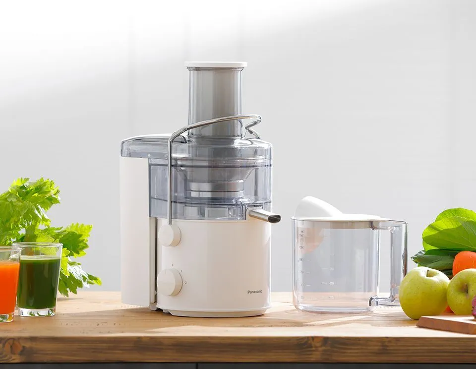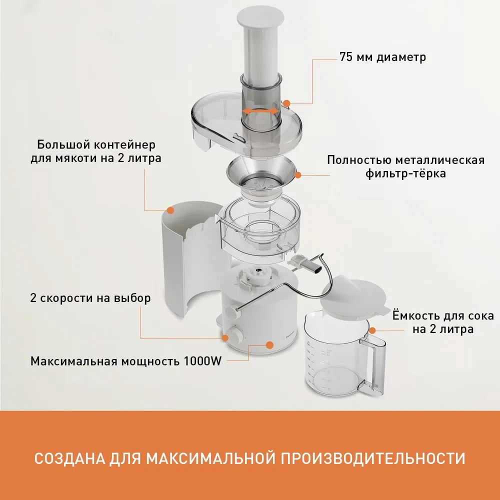 Большая емкость контейнера для мякоти объемом 2 л позволяет одновременно приготовить сок из 10 яблок или множества других фруктов и овощей. Это экономит время и силы.