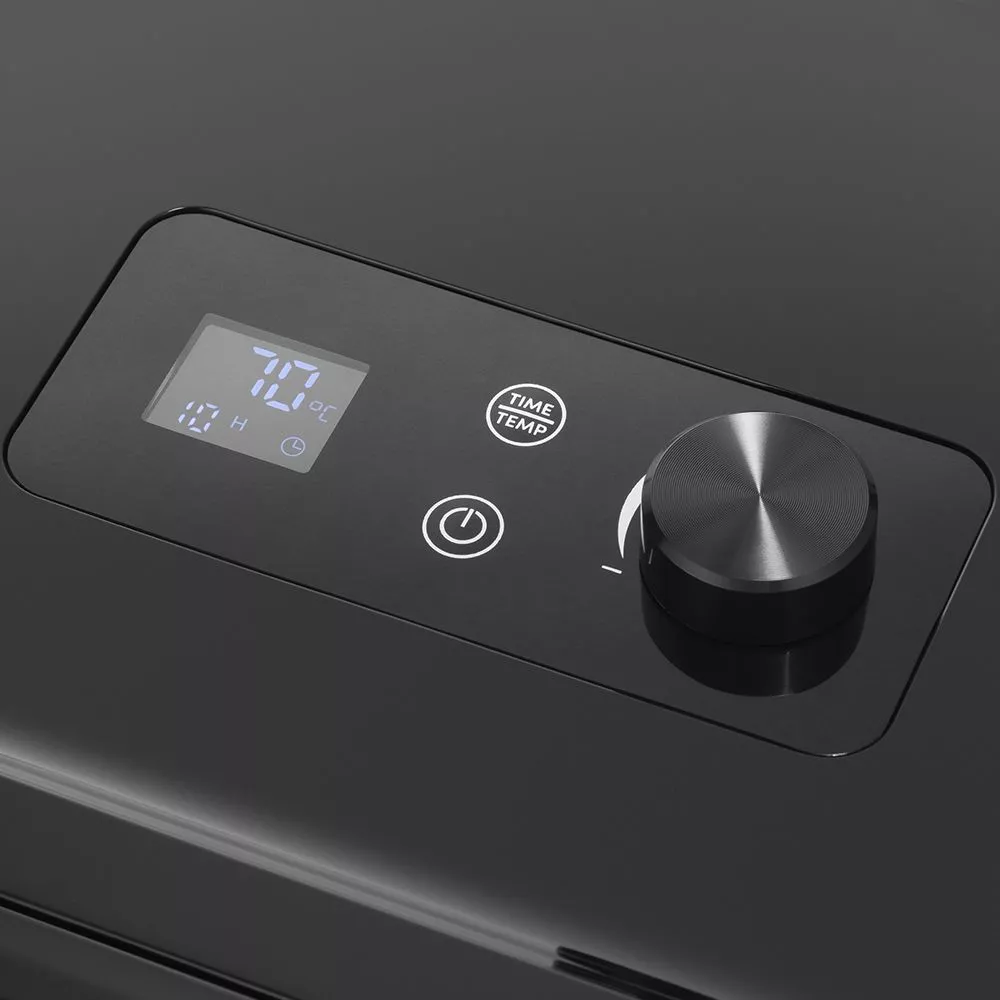 На сушилке можно установить температуру сушки в диапазоне 35–70 оС с шагом 5 градусов. Сушилка оснащена таймером до 24 часов работы с шагом 1 час. Дисплей показывает температуру сушки и время таймера. Кнопка «Старт/Стоп» запускает и останавливает процесс сушки. Кнопка «Температура/Время» позволяет переключиться между настройками времени и температуры сушки.
