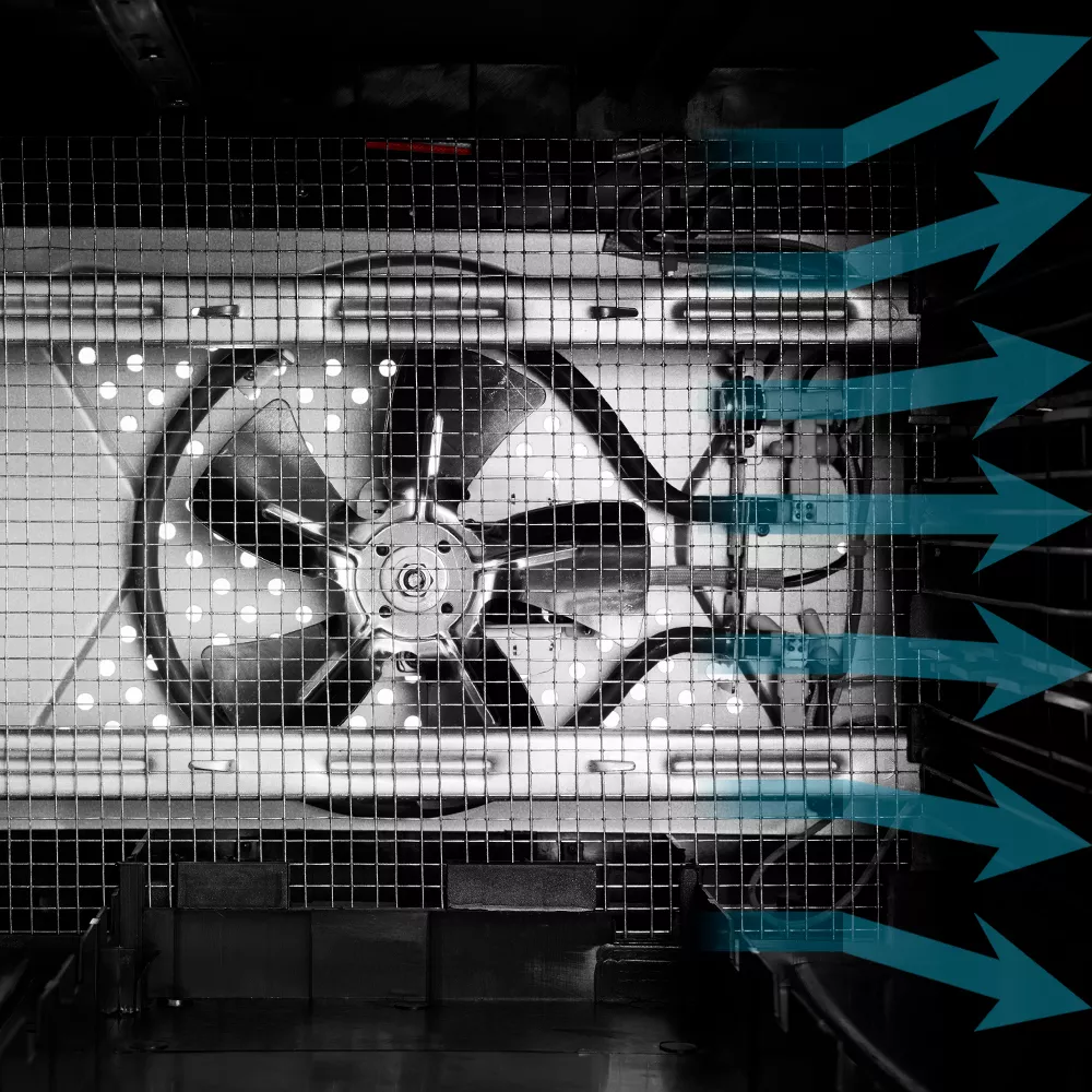 Сушилка оборудована большим мощным вентилятором, что обеспечивает равномерный горизонтальный обдув всех 6 поддонов. Поток воздуха направлен горизонтально, поэтому запахи продуктов с разных поддонов не смешиваются.