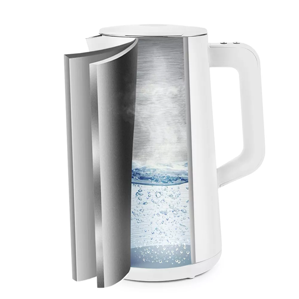 Корпус чайника двойной: внутри он выполнен из нержавеющей стали SUS304, а снаружи защищен прочным пластиком, что предотвращает опасность обжечься, а также делает чайник более экономичным, так как двойной корпус лучше сохраняет тепло.