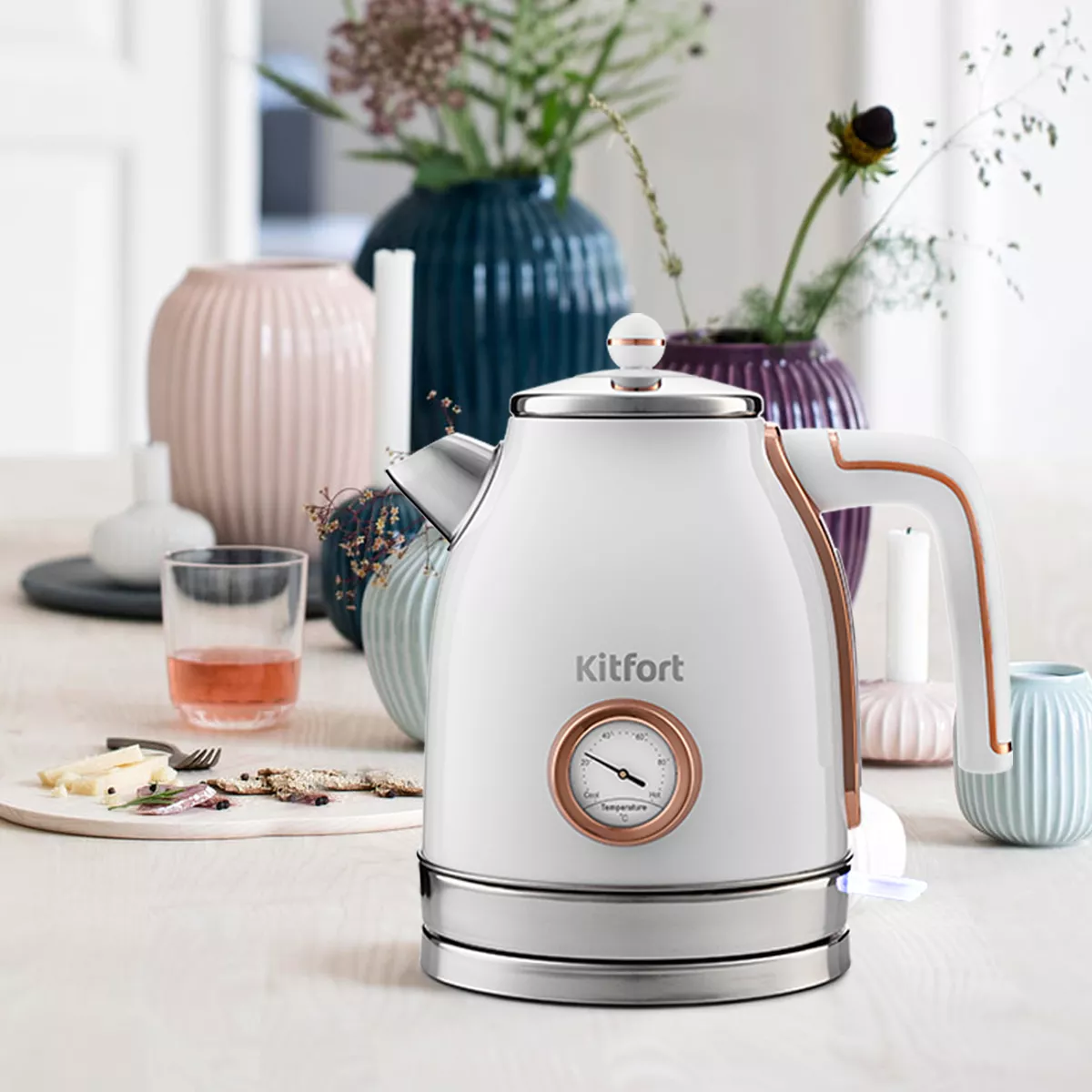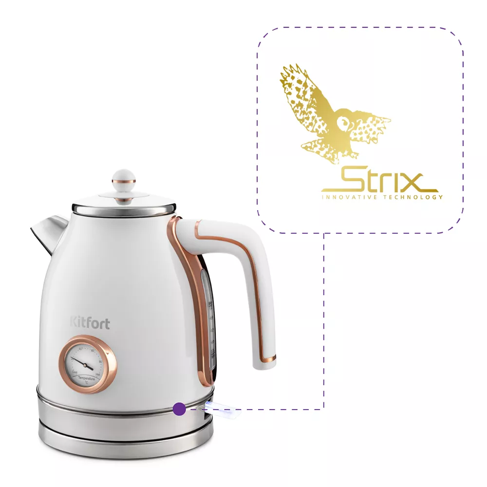 Чайник оснащён контроллером Strix - № 1 среди поставщиков компонентов для электрочайников. Он устраняет риски короткого замыкания и возгорания прибора. Обеспечивает защиту при закипании, при включении чайника без воды.