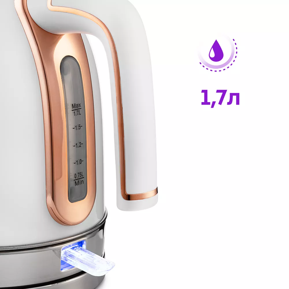 За один раз в чайнике можно вскипятить до 1,7 л воды. Этого хватит, чтобы приготовить горячие напитки на большую семью! Мерная шкала позволяет легко следить за уровнем воды. В кнопку включения/выключения встроен индикатор нагрева. Крышка чайника полностью съёмная, что облегчает доступ внутрь чайника.