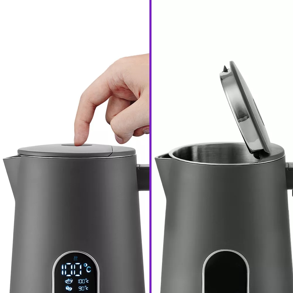 Чайник имеет широкое горлышко и легко открывается в 1 нажатие благодаря кнопке, расположенной наверху крышки. Его быстро и удобно наполнять водой и чистить в случае необходимости. Для вашего удобства на ручке чайника находится управление функциями нагрева и кипячения воды, а также поддержания температуры до 24 часов.