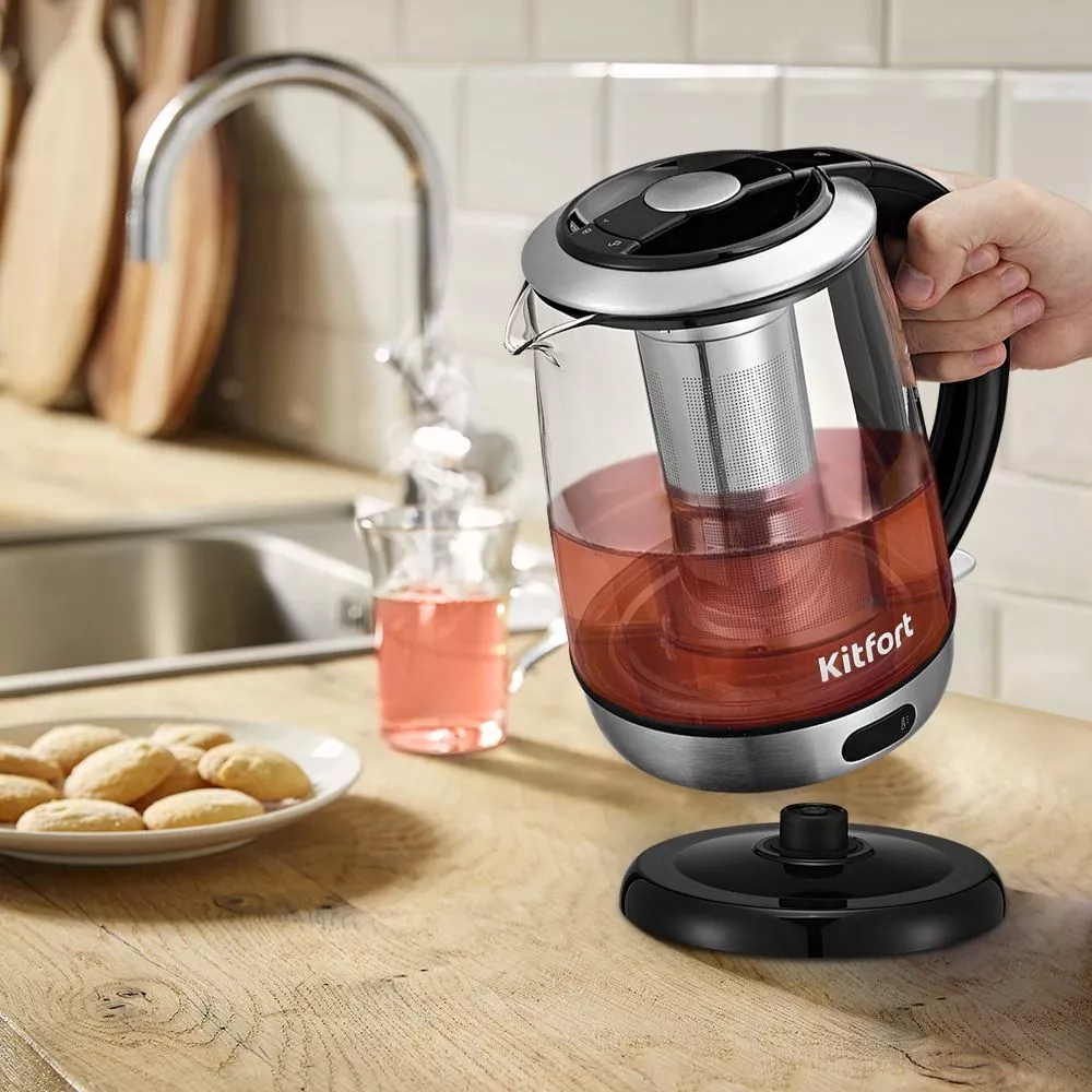В чайнике КТ-6155 есть встроенный фильтр для заварки чая, а также предустановлены температуры заваривания для популярных сортов чая. Вам нужно только засыпать чайные листья в корзину, залить воду и выбрать необходимую температуру.