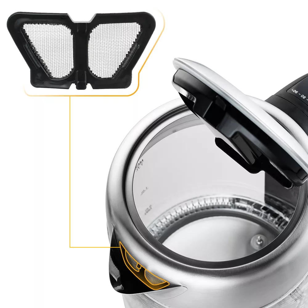 Чайник имеет большое горлышко, что облегчает доступ внутрь при мытье, а также съёмный фильтр-сетку для защиты от накипи.