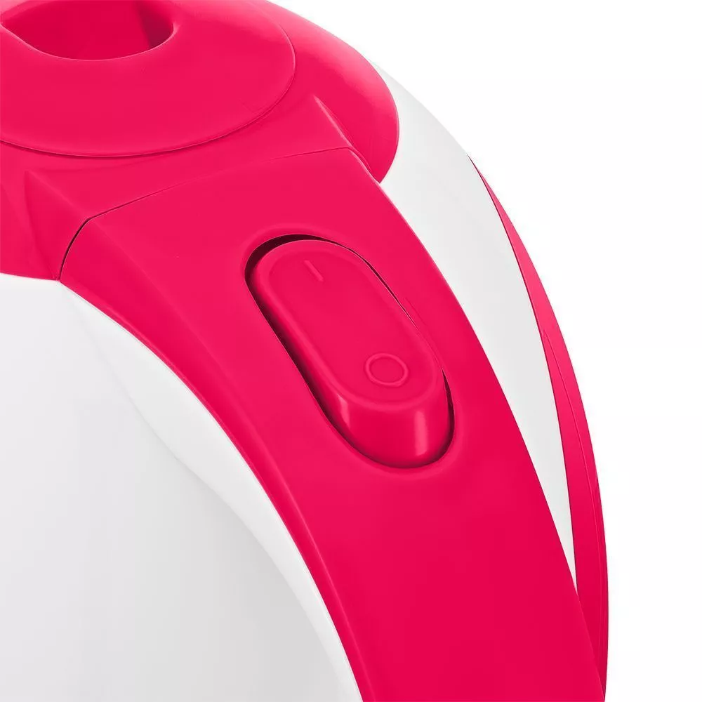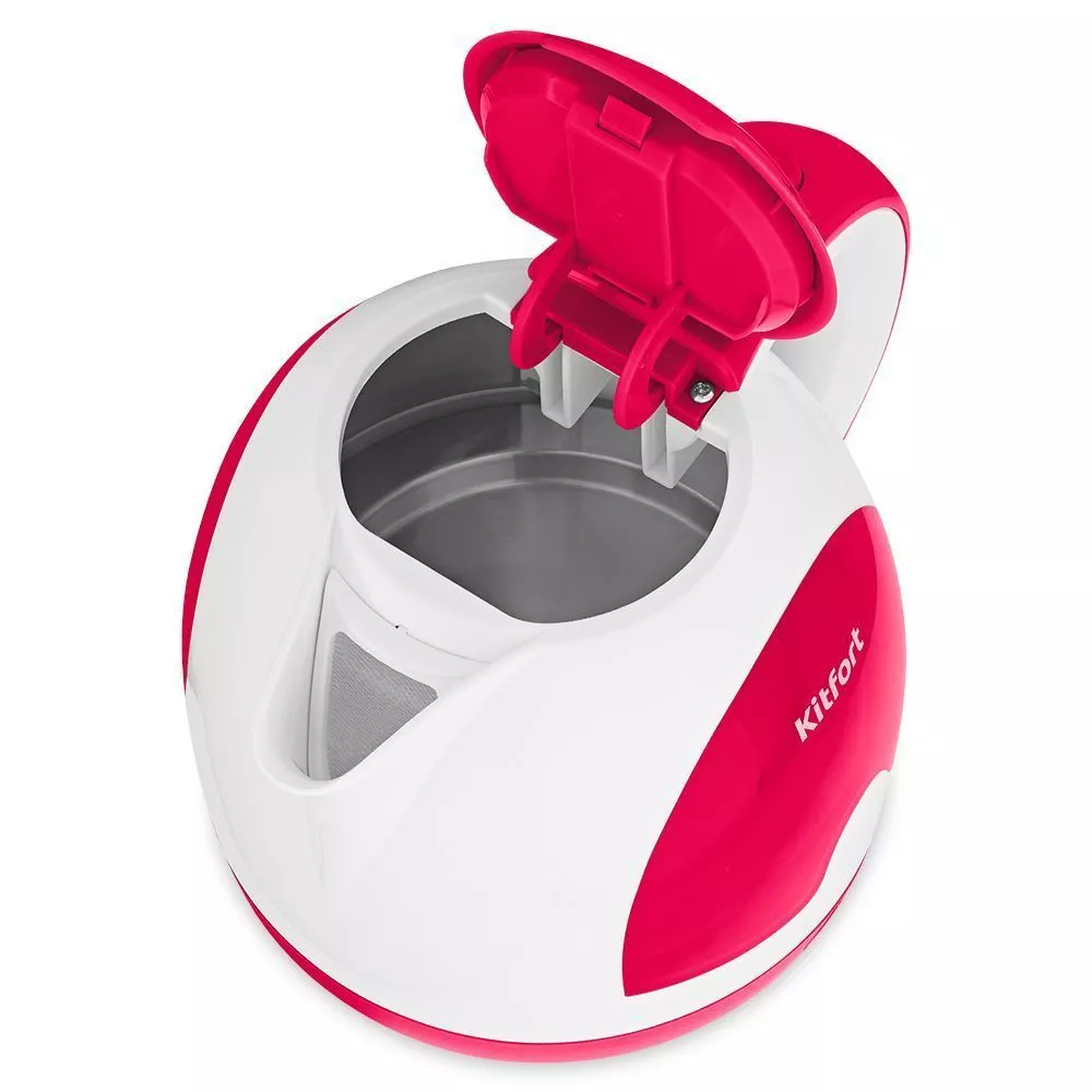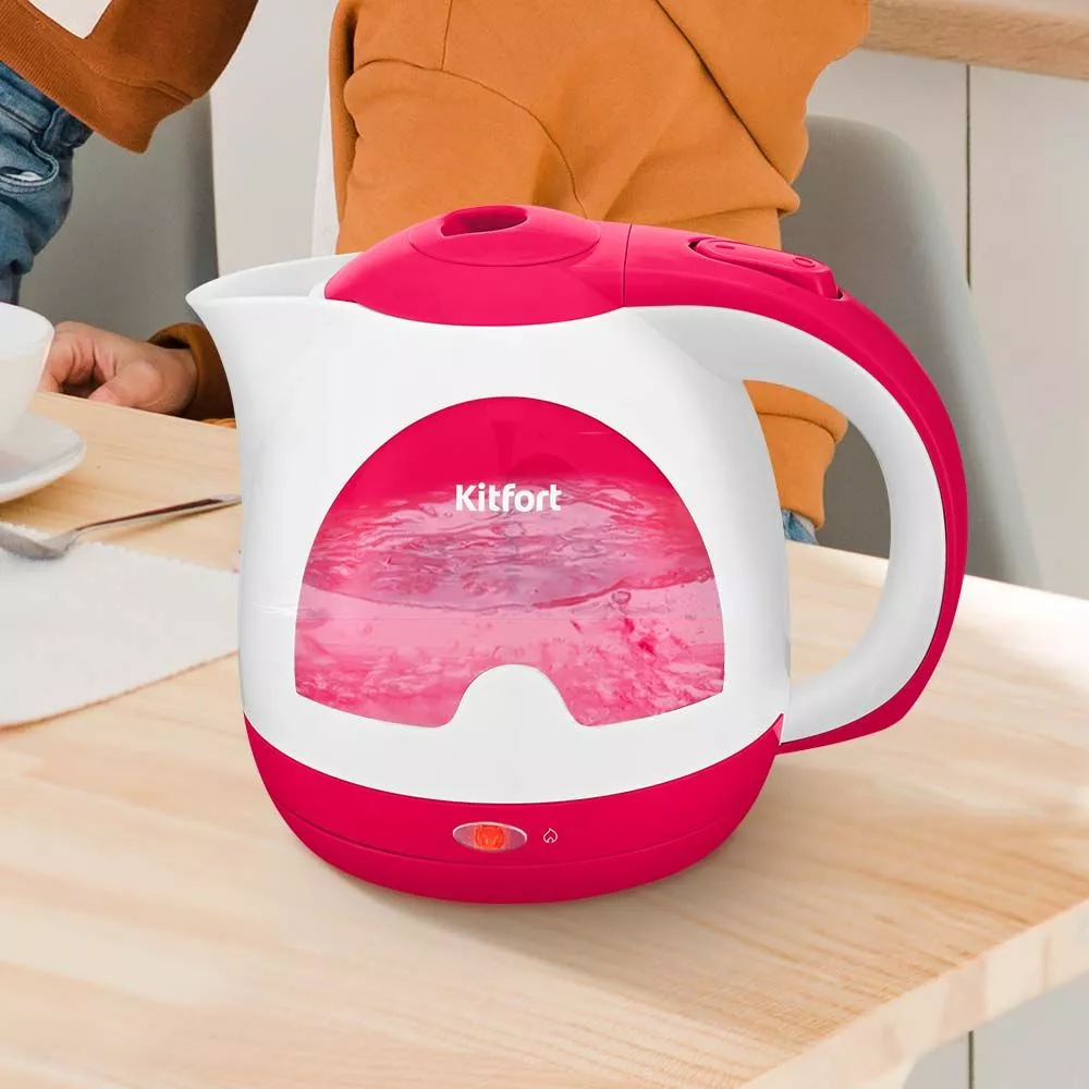 Корпус чайника, крышка и подставка выполнены из пластика. Мерная шкала находится на прозрачной части колбы. Ручка чайника не нагревается и удобно лежит в руке. Кнопка открывания крышки расположена на крышке, а кнопка включения — на ручке. При включении чайника загорается индикатор работы.