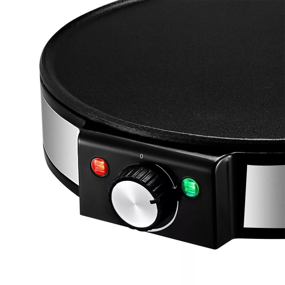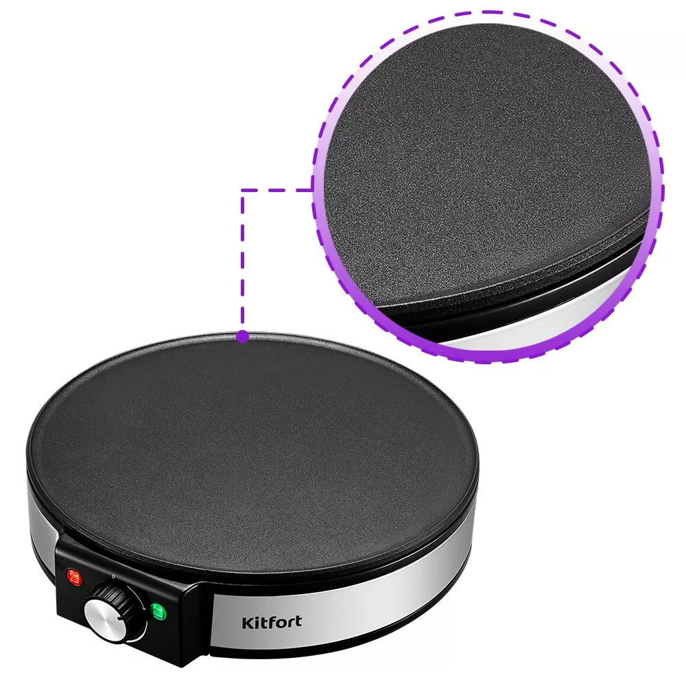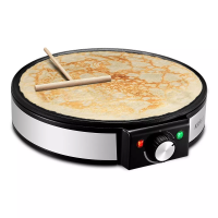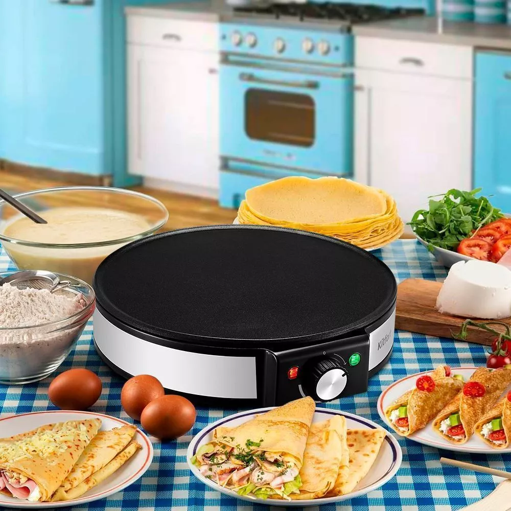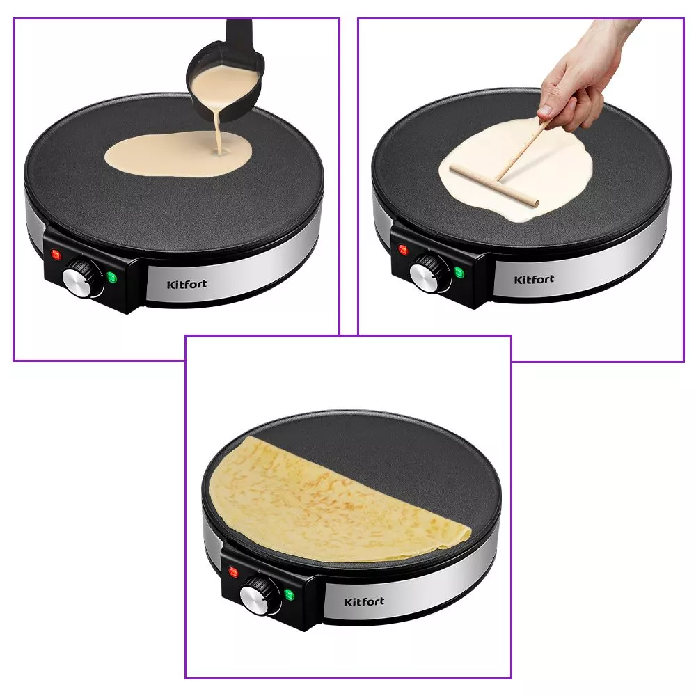 Блинницу не нужно устанавливать на плиту, поэтому можно готовить на любой удобной ровной поверхности, устойчивой к высоким температурам. С помощью палочки для распределения теста блин получается идеально ровной и той толщины, которую хотите вы.