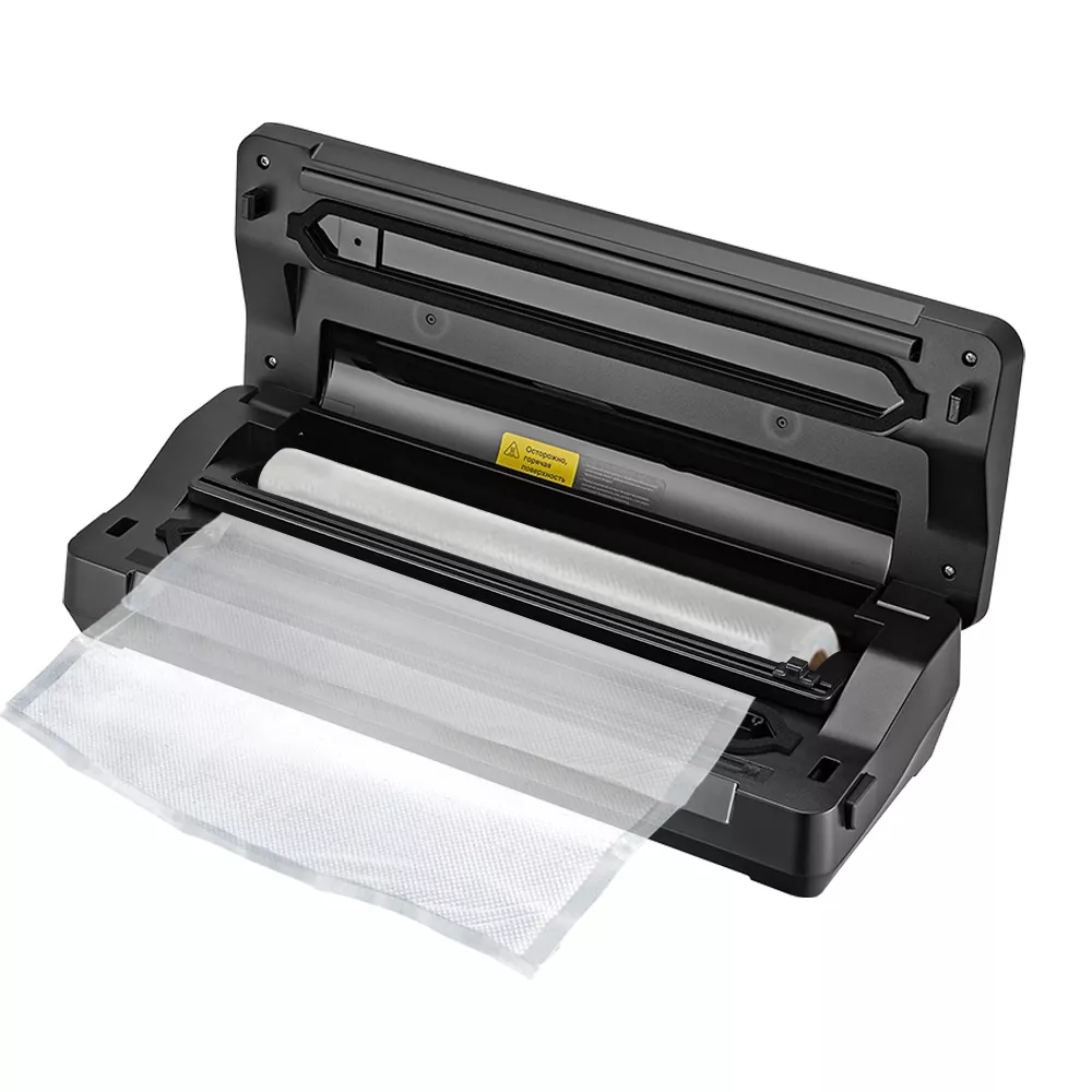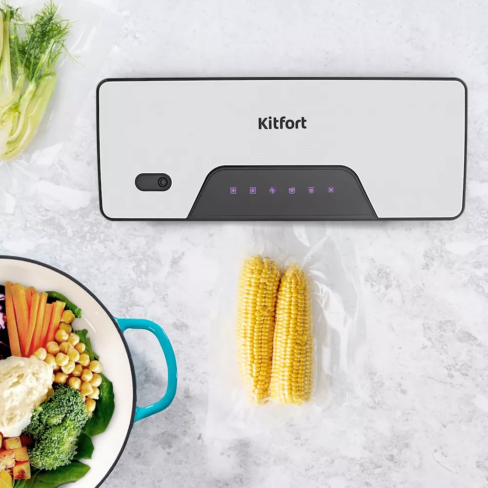 В модели КТ-1517 предусмотрен специальный отсек для рулонов и резак. С их помощью вы можете самостоятельно сделать вакуумные пакеты. Вначале сформируйте дно пакета, запаяв открытый конец рукава плёнки, а затем с помощью бегунка отрежьте необходимую длину.