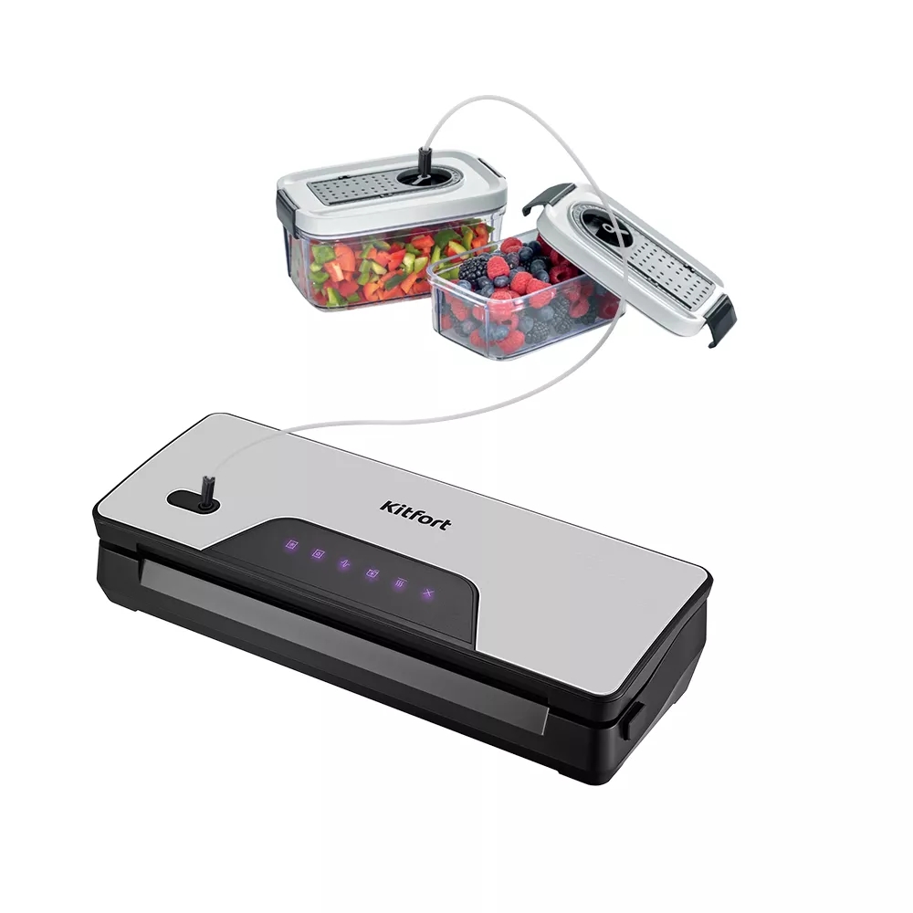 Панель управления отвечает за режимы работы: «Сухо» – вакууматор откачает воздух из пакета, а затем запечатает его; «Импульс» – откачка осуществляется, пока вы держите кнопку нажатой; «Пайка» – устройство запаяет пакет без вакуумирования; «Отмена»– останавливает процесс выполнения любого действия. У КТ-1517 также есть режим откачки воздуха из контейнеров. Вакуумирование происходит при помощи шланга, вставленного в фитинг вакууматора одним концом, а другим в крышку контейнера. Вы можете дополнительно приобрести набор контейнеров КТ-1500-10.
