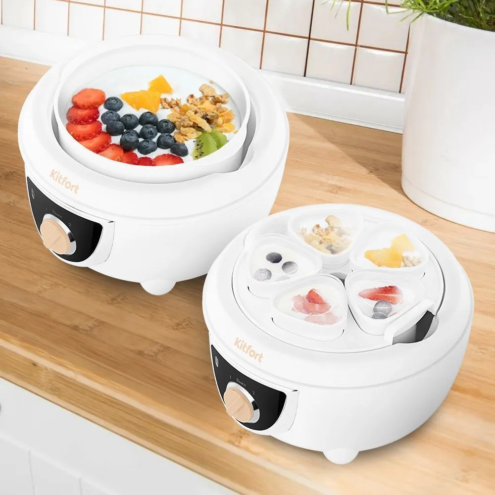 Прибор укомплектован чашей ёмкостью 1 литр, а также 5 пластиковыми баночками ёмкостью 150 мл каждая. Вы можете приготовить йогурт в баночках, чтобы сразу разделить его на порции, или в чаше, чтобы смешивать ингредиенты, не используя дополнительную посуду.