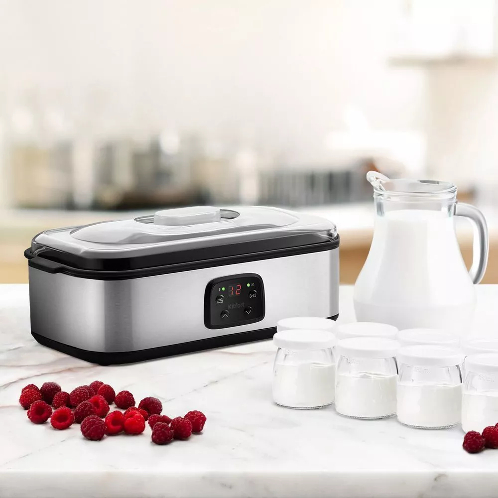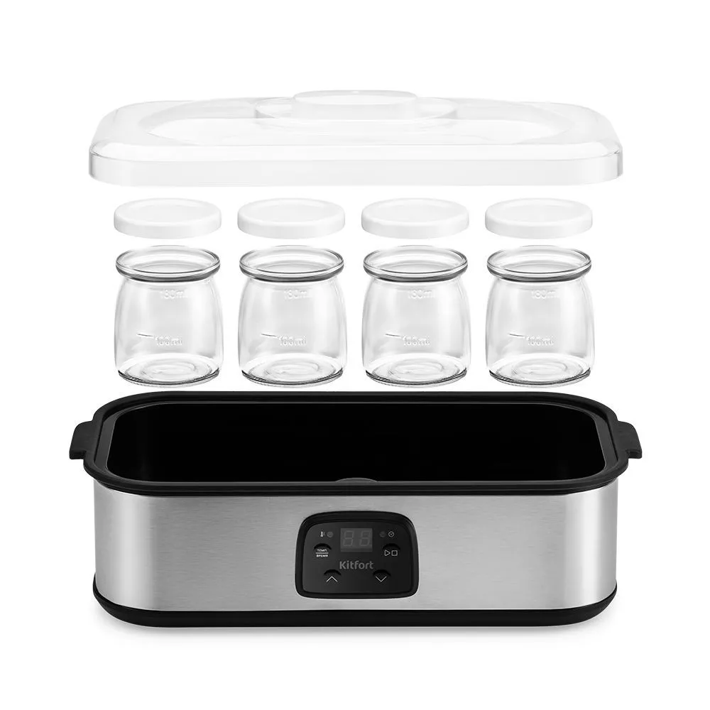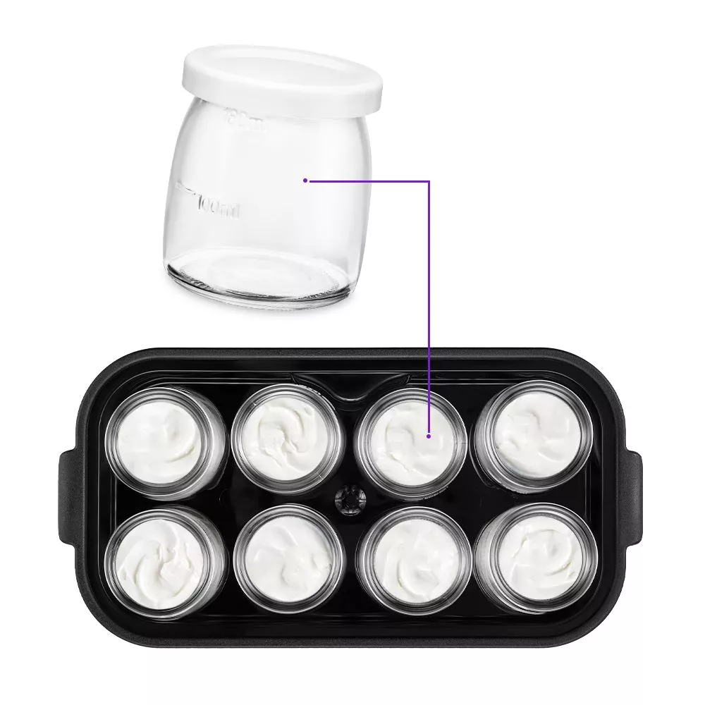 В комплекте идут 8 стеклянных баночек по 180 мл, в которых готовый йогурт можно хранить в холодильнике. Стеклянные баночки сохраняют натуральные свойства домашнего йогурта, а также являются экологически чистым материалом.