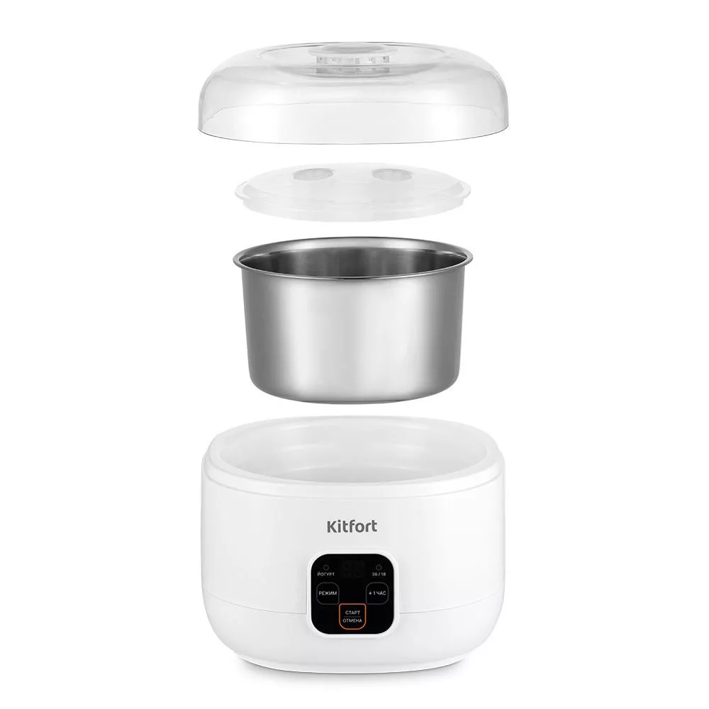 Готовить йогурт с КТ-6082 очень легко. Просто смешайте молоко и закваску в чаше, далее установите чашу в йогуртницу. Выберите режим приготовления, установите время и нажмите кнопку старта. Спустя 8 часов натуральный, полезный продукт будет готов! Йогуртница равномерно нагревает чашу с ингредиентами, поддерживая заданную температуру. Прибор укомплектован чашей из нержавеющей стали на 1 литр с пластиковой крышкой. Готовый йогурт можно хранить в холодильнике прямо в чаше.